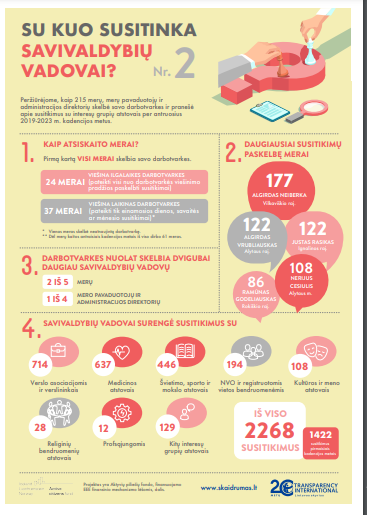 Dvigubai daugiau savivaldybių vadovų, t.y. merų, merų pavaduotojų ir administracijos direktorių, nuolat skelbė, su kuo susitiko darbo metu antraisiais savo kadencijos metais. Jie taip pat paviešino pusantro karto daugiau susitikimų su interesų grupių atstovais (iš viso – 2268, prieš metus – 1422).