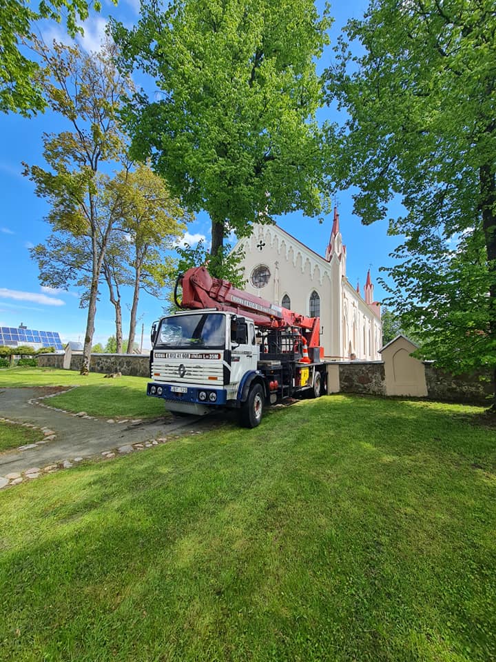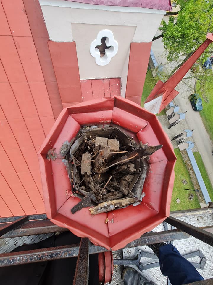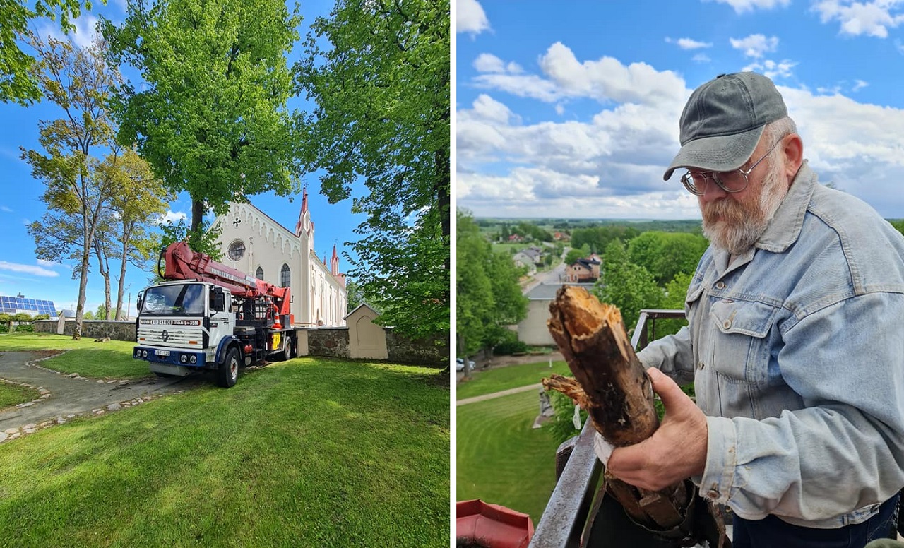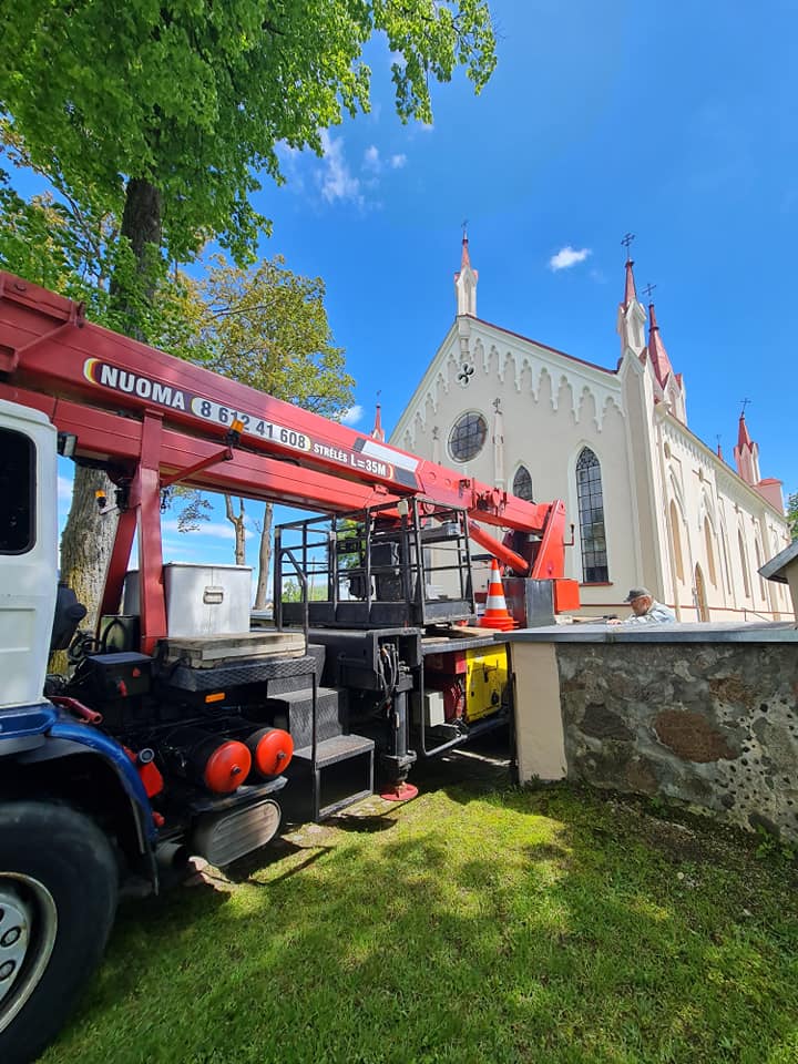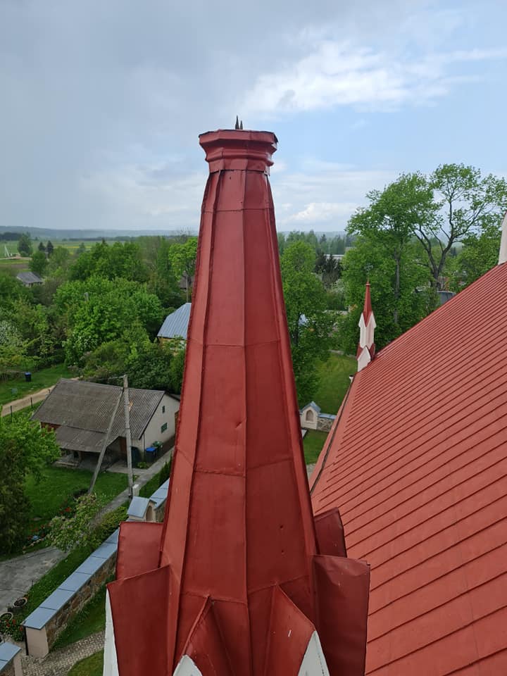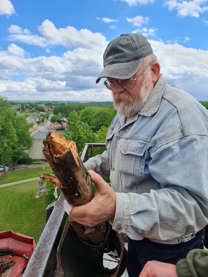 Dėkojame Juozui Kalinauskui už laiką ir drąsą išmontuojant kryžių. Laukia dabar didelis darbas surasti tinkamą sprendimą kaip suremontuoti, kuo užpildyti vidines bokštelio ertmes. O kryžių grąžinti į vietą būtinai reikia nes mūsų bažnyčios fasadas be šio kryžiaus atrodo lyg šypsena be priekinio danties.