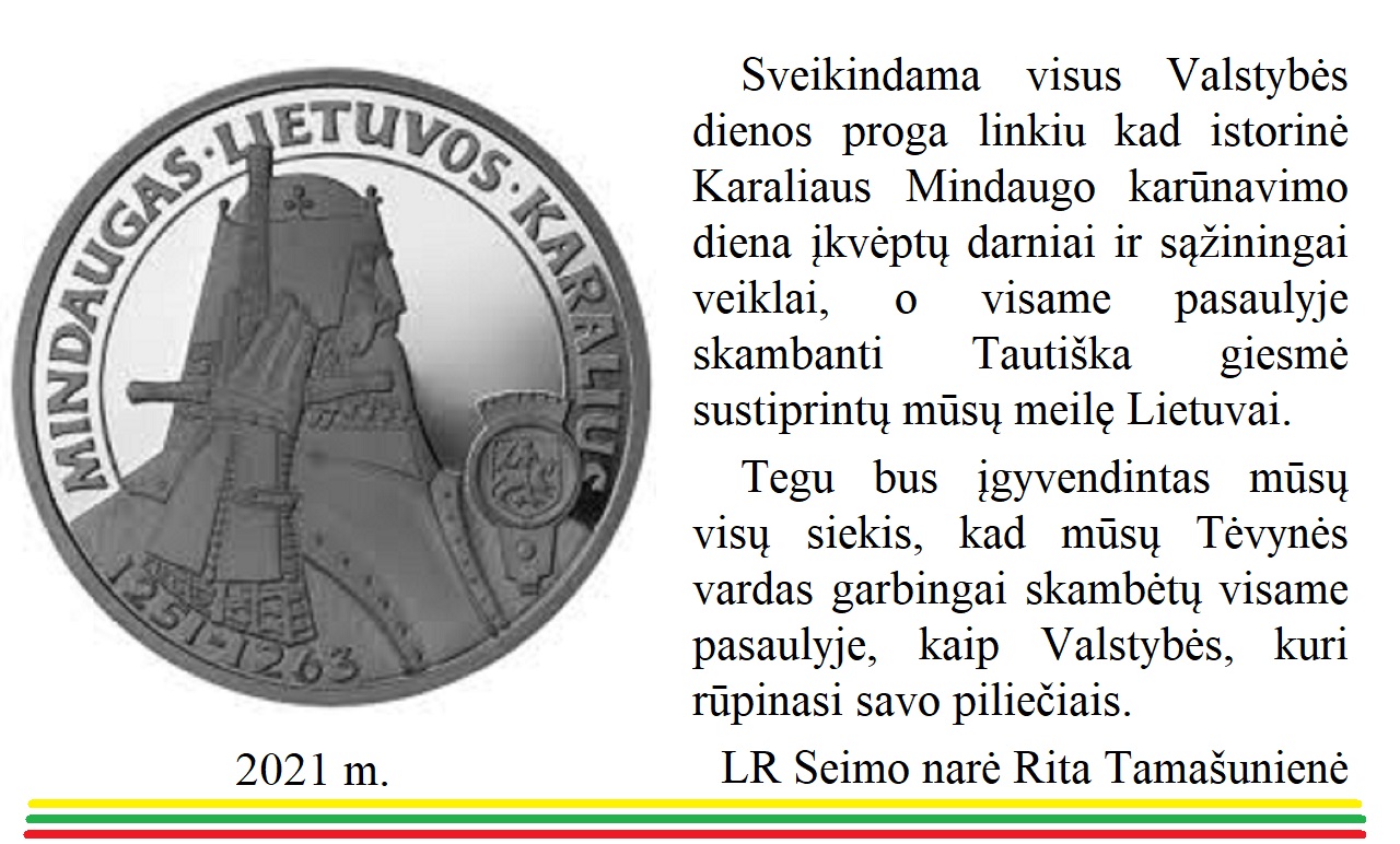 Sveikindama visus Valstybės dienos proga linkiu kad istorinė Karaliaus Mindaugo karūnavimo diena įkvėptų darniai ir sąžiningai veiklai, o visame pasaulyje skambanti Tautiška giesmė sustiprintų mūsų meilę Lietuvai.