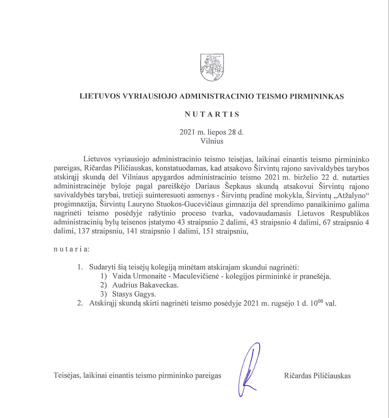 Rugsėjo 1 d. Lietuvos vyriausiasis administracinis teismas nagrinės atskirąjį skundą atsakovui Širvintų rajono savivaldybės tarybai dėl sprendimo panaikinimo.