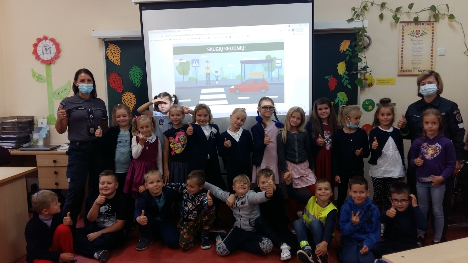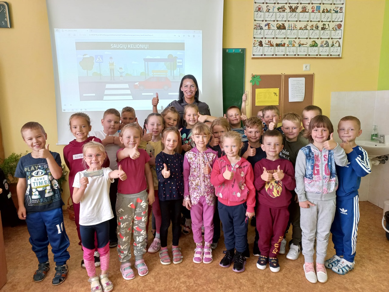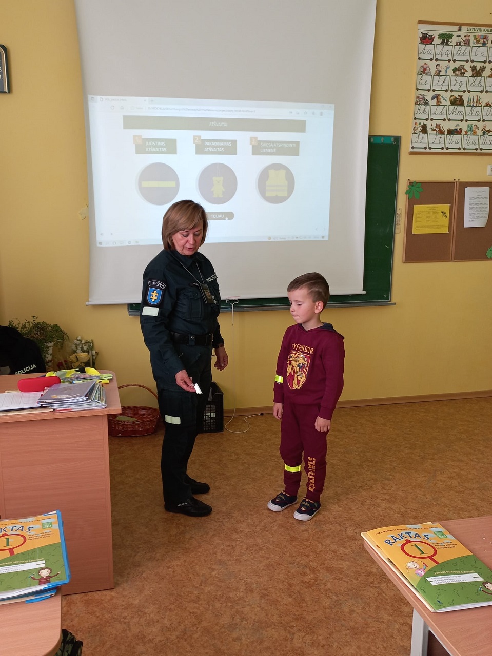 Pirmokėliams pravedė pamokas apie saugų eismą: priminė pagrindines saugaus elgesio kelyje taisykles, kaip reikia elgtis gatvėje, paaiškino kaip tinkamai nešioti atšvaitus, kodėl privaloma automobilyje segėti saugos diržus. Padėjo suvokti eismo sistemą „Eismo dalyvis–transporto priemonė–kelias–eismo aplinka“. Acentavo, kad atšvaitas maža, tačiau labai svarbi ir pati geriausia bendravimo su vairuotoju saugos priemonė. Pareigūnės linkėjo augti sveikiems, linksmiems, neišbarstyti suteiktų žinių ir būti atsargiems kelyje.