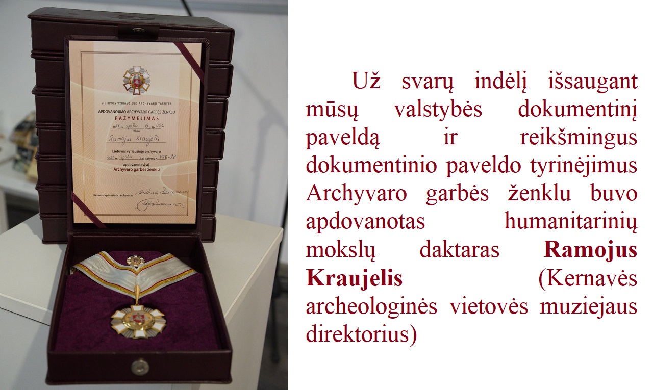 Renginio metu už svarų indėlį išsaugant mūsų valstybės dokumentinį paveldą ir reikšmingus dokumentinio paveldo tyrinėjimus Archyvaro garbės ženklu buvo apdovanoti istorikas, humanitarinių mokslų daktaras Arvydas Anušauskas, pedagogas, Amerikos lietuvių kultūros archyvo (ALKA) direktorė ir valdybos pirmininkė Mirga Girniuvienė,istorikas prof. Arūnas Gumuliauskas, Lietuvos Respublikos Seimo kanceliarijos Dokumentų departamento Archyvo skyriaus vedėja Vida Kišūnienė,istorikas, humanitarinių mokslų daktaras Ramojus Kraujelis, Klaipėdos universiteto Baltijos regiono istorijos ir archeologijos instituto (BRIAI) vyresnysis mokslo darbuotojas, humanitarinių mokslų daktaras Vacys Vaivada, Lietuvos gyventojų genocido ir rezistencijos tyrimo centro direktorius, istorikas Arūnas Bubnys, Lietuvos diplomatas, ambasadorius, istorikas Vytautas Žalys.Kanados lietuvių muziejaus-archyvo vadovei Danguolei Juozapavičiūtei-Breen skirtas apdovanojimas dar prieš renginį diplomatiniu paštu iškeliavo į Kanadą.Seimo kanceliarijos fotografės Džojos Gundos Barysaitės nuotr. nr. 15;9;16.