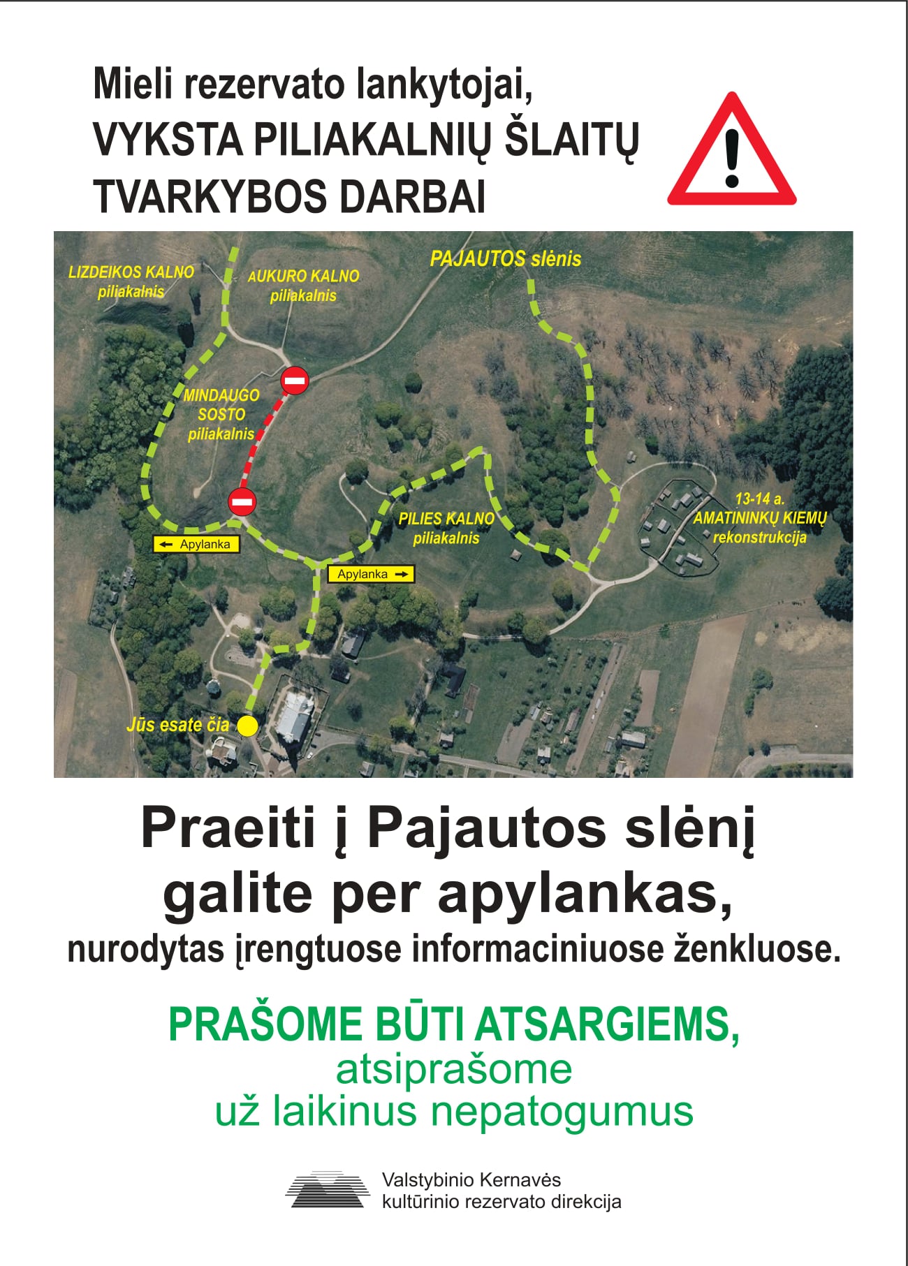 Piliakalnių šlaituose grunto nukasimo darbai bus atliekami tik vietose, kuriose paviršinis gruntas jau yra pažeistas (įtrūkęs) ar nuslinkęs, pvz.: Mindaugo sosto piliakalnio nuslinkusiame vakariniame šlaite. Darbų vykdymo vietose Direkcijos archeologinius žvalgymus vykdo Valstybinio Kernavės kultūrinio rezervato direkcijos archeologai, o darbų metu nukastas gruntas bus saugomas ir toliau tiriamas Rezervato kraštovaizdžio vizualiai neįtakojančioje teritorijoje.