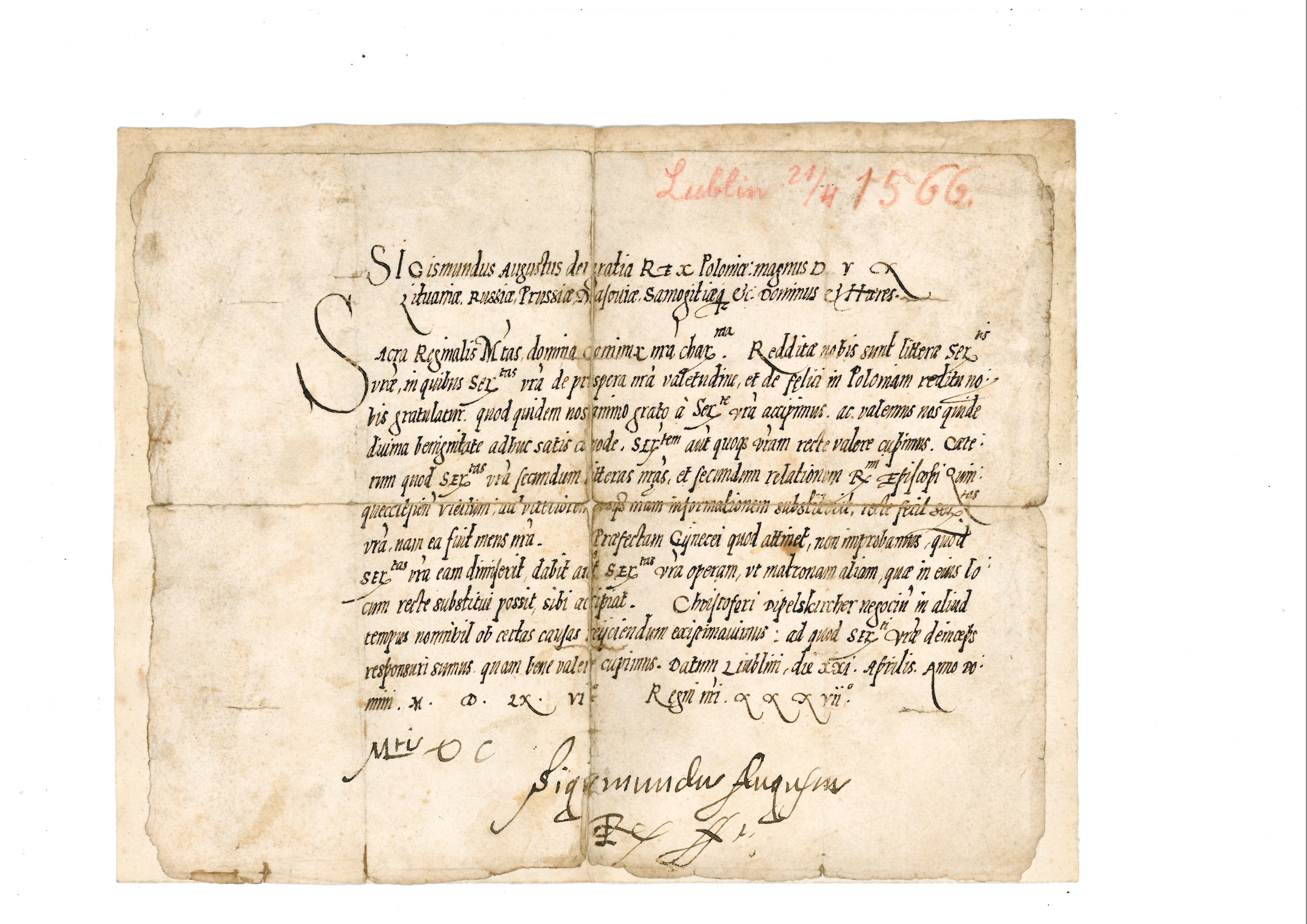 Valdovų rūmų muziejaus rinkiniai pasipildė nauju eksponatu – Lenkijos karaliaus ir Lietuvos didžiojo kunigaikščio Žygimanto Augusto (1544/1548–1572) laišku žmonai Kotrynai Habsburgaitei (1533–1572), rašytu 1566 m. balandžio 21 d. Liubline. Jo atsiradimo istorija apgaubta mįslėmis. XVI a. valdovo, paskutiniojo Jogailaičio Lenkijos ir Lietuvos sostuose laišką vienas Austrijos Graco miesto antikvarų rado dėžėje kartu su istoriniais karybos daiktais. Antikvariato darbuotojai nusprendė, kad šis dokumentas galėtų būti įdomus Lietuvos ar Lenkijos kolekcininkams, bibliotekoms bei muziejams, ir paskelbė parduodą netikėtai atrastą Žygimanto Augusto laišką aukcione. Valdovų rūmų muziejus įsigijo šį laišką, nes muziejuje kaupiamas rūmų šeimininkų autografų rinkinys, be to, Žygimantas Augustas daug laiko praleido Vilniuje ir mėgo šį miestą. Jam valdant Vilnius buvo tapęs faktine ne tik Lietuvos, bet ir Lenkijos sostine, šio valdovo rūpesčiu buvo baigti renesanso stiliumi rekonstruoti Lietuvos didžiųjų kunigaikščių rūmai, juose sukauptos Europą stulbinusios brangenybių, meno, ginklų šarvų, retenybių kolekcijos, turtinga biblioteka.