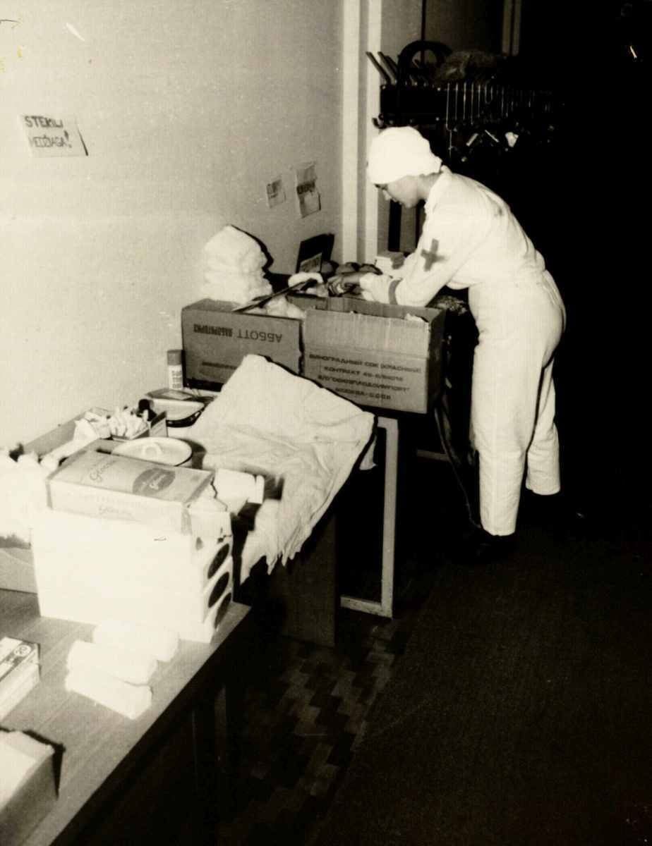 radau nematytas Rolando Ginaičio darytas nuotraukas. Jose baltais mediko rūbais esu aš. Vienoje nuotraukoje dėlioju tvarsliavą, kitoje- perkraunu medicininį krepšį, kad tilptų daugiau tvarsliavos. Tuo laikotarpiu sunau