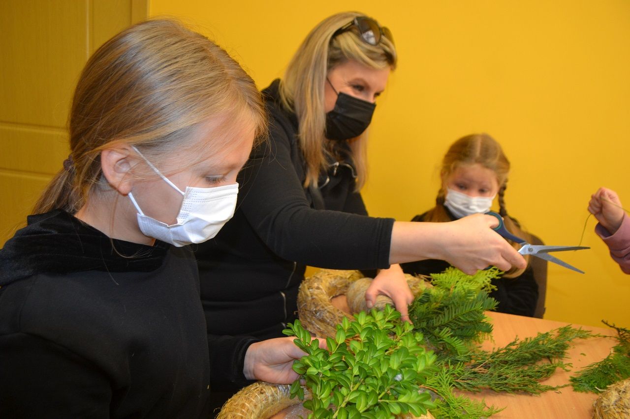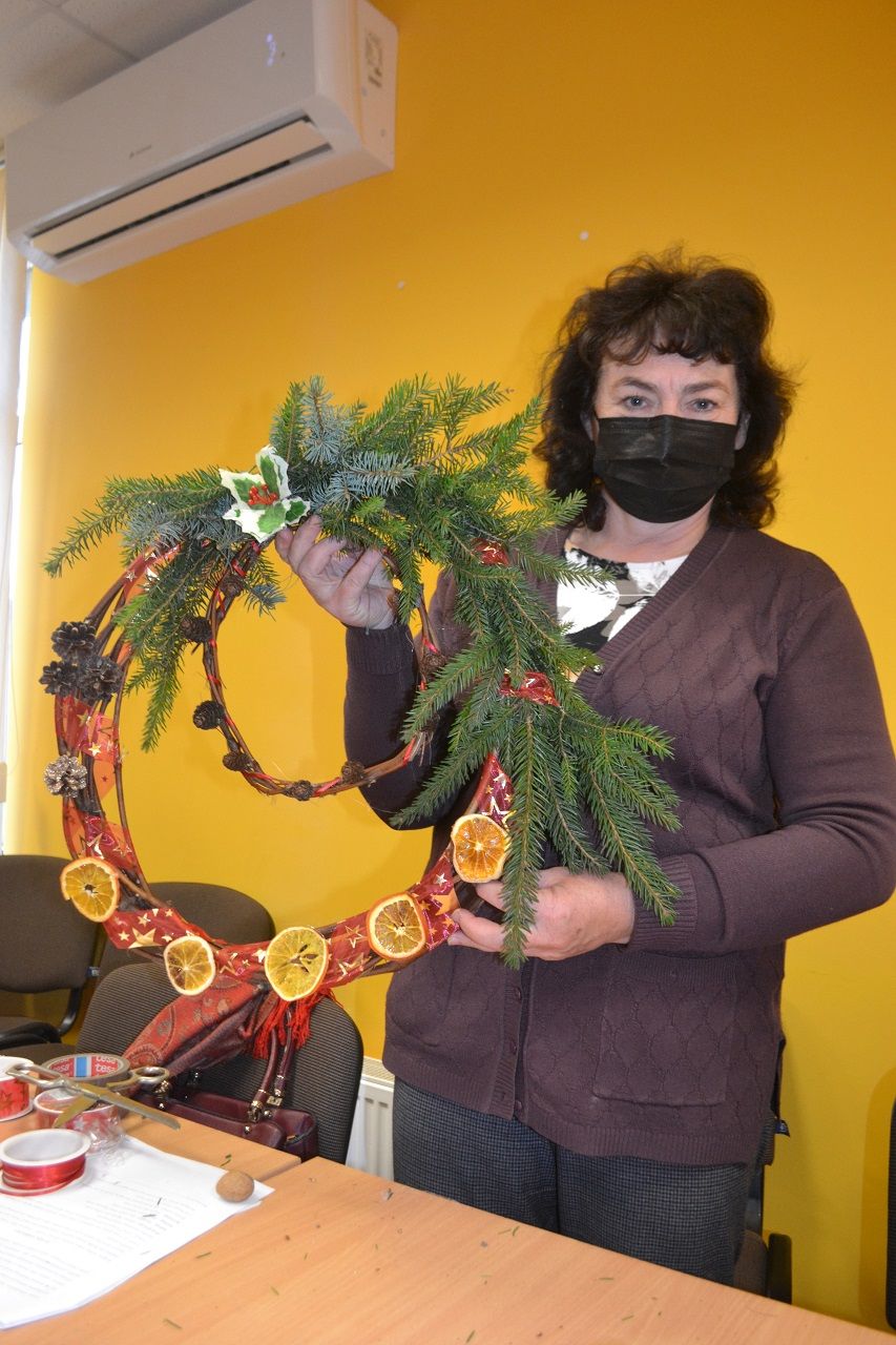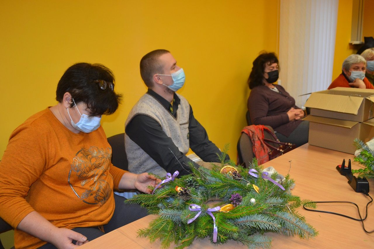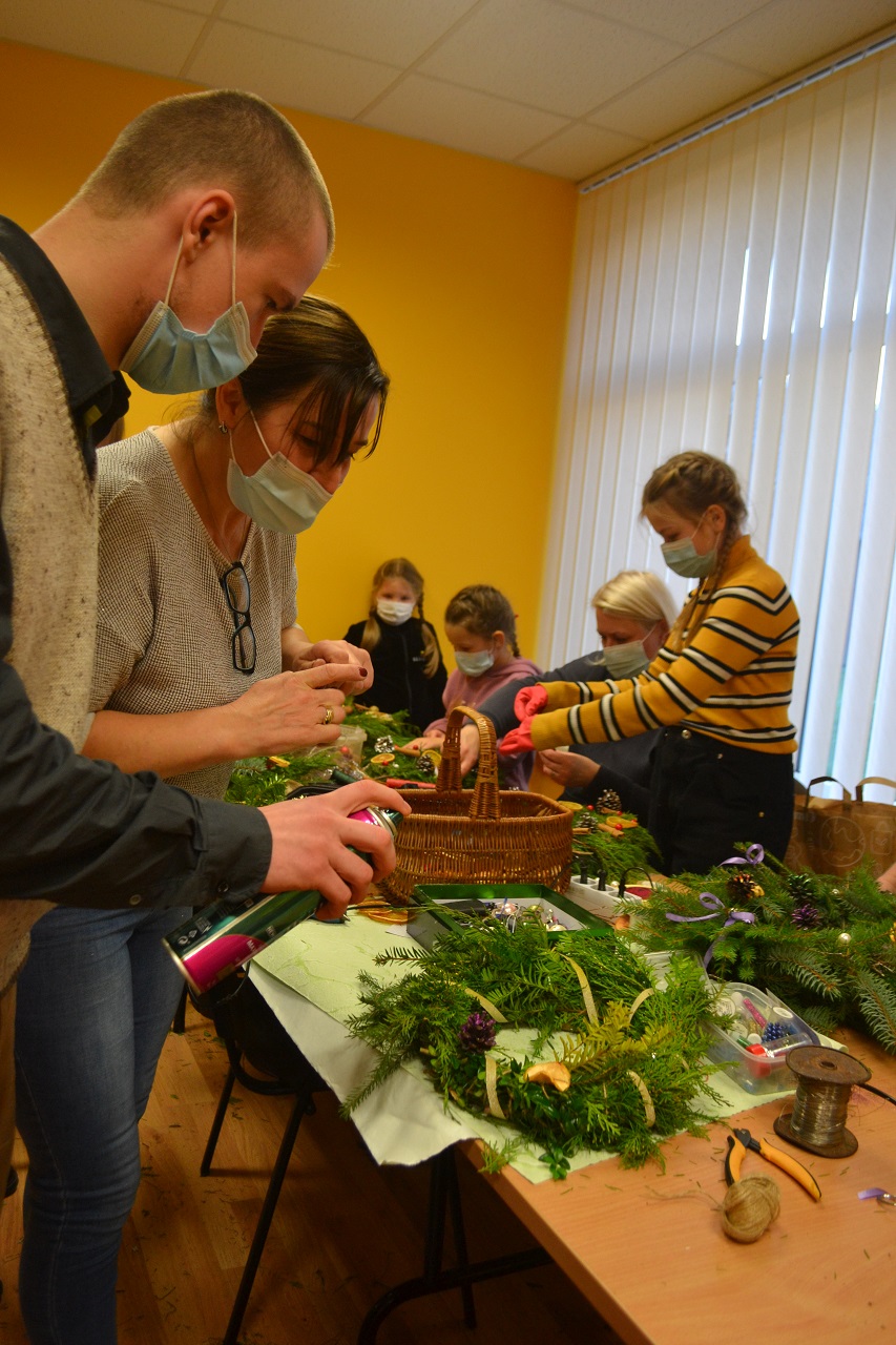 Edukatorė Jelena Masiukė mokė vainiko pynimo ir dekoravimo technikos. Ji pasakojo apie tokių vainikų atsiradimo istoriją, kaip ir kodėl jie buvo pinami, kuo puošiami.