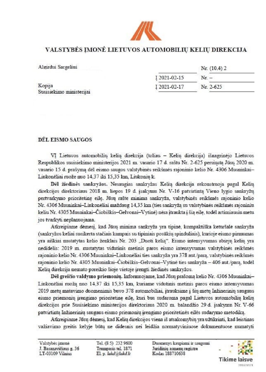 Dėl greičio valdymo priemonių. Informuojame, kad Jūsų prašomą kelio Nr. 4306 Musninkai–Liukonėliai ruožą nuo 14,37 iki 15,35 km, kuriame vidutinis metinis paros eismo intensyvumas 2019 metų matavimo duomenimis buvo 378 automobiliai, įtrauksime į šių metų Inžinerinių saugaus eismo priemonių įrengimo prioritetinę eilę, kuri bus sudaroma pagal Lietuvos automobilių kelių direkcijos prie Susisiekimo ministerijos direktoriaus 2020 m. balandžio 29 d. įsakymu Nr. V-66 patvirtintą Inžinerinių saugaus eismo priemonių įrengimo prioritetinės eilės sudarymo metodiką.