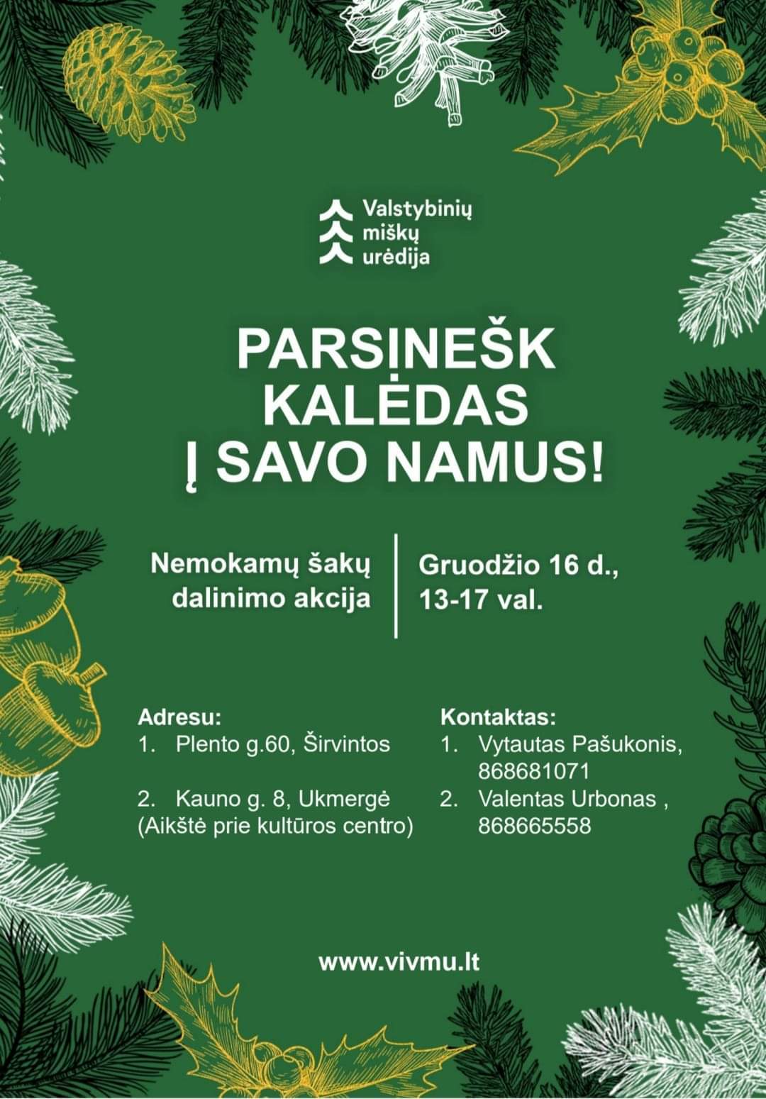 Š. m. gruodžio 16 d. nuo 13 iki 17 val. VĮ Valstybinių miškų urėdijos miškininkai kviečia gyventojus į tradicinę iniciatyvą „Parsinešk Kalėdas į savo namus“, kurios metu dovanos eglės šakas. Taip miškus prižiūrintys specialistai ragina ugdyti atsakingumą – miškuose nekirsti jaunų eglučių, nelaužyti jų šakų, skatina tausojantį ir ekologišką vartojimą.