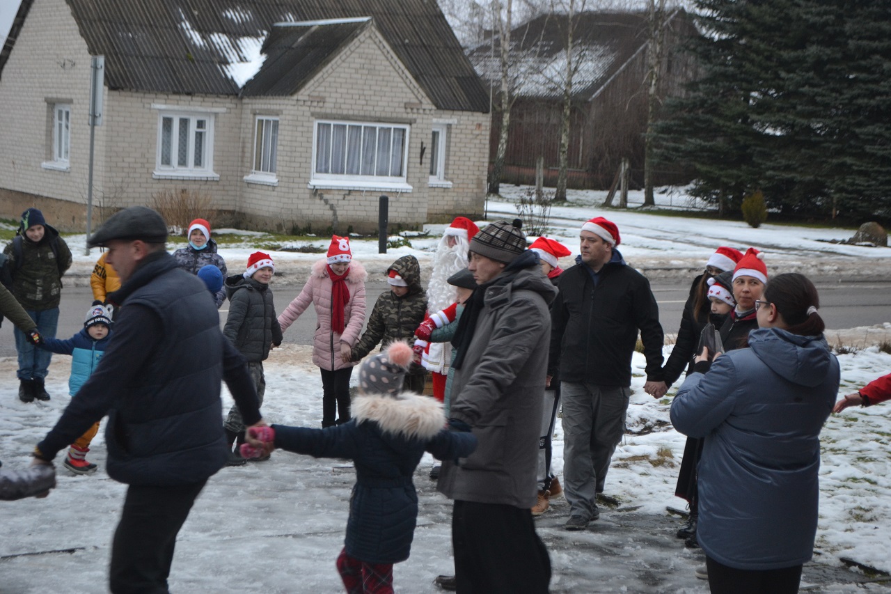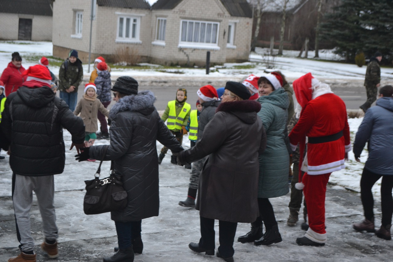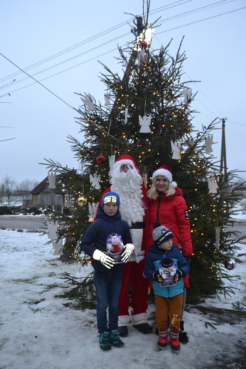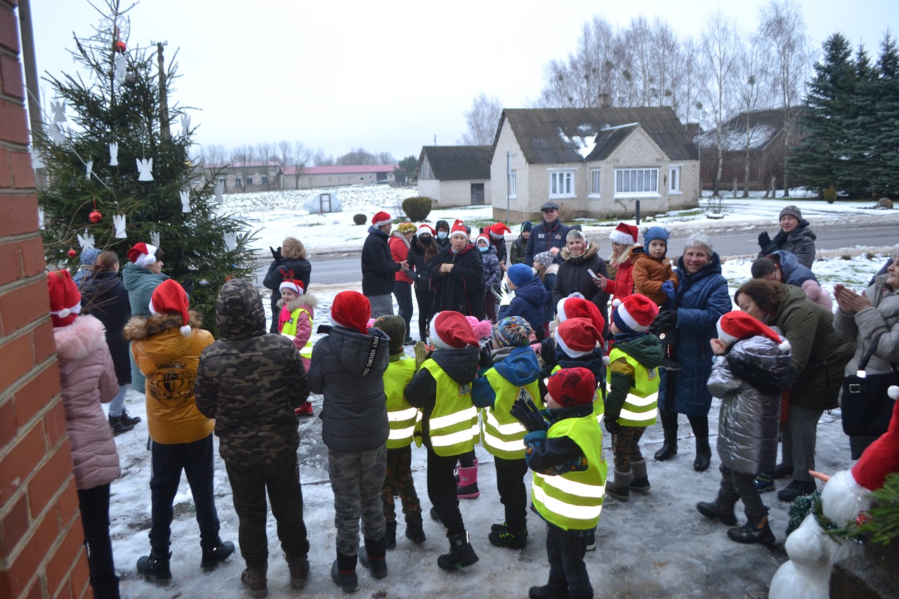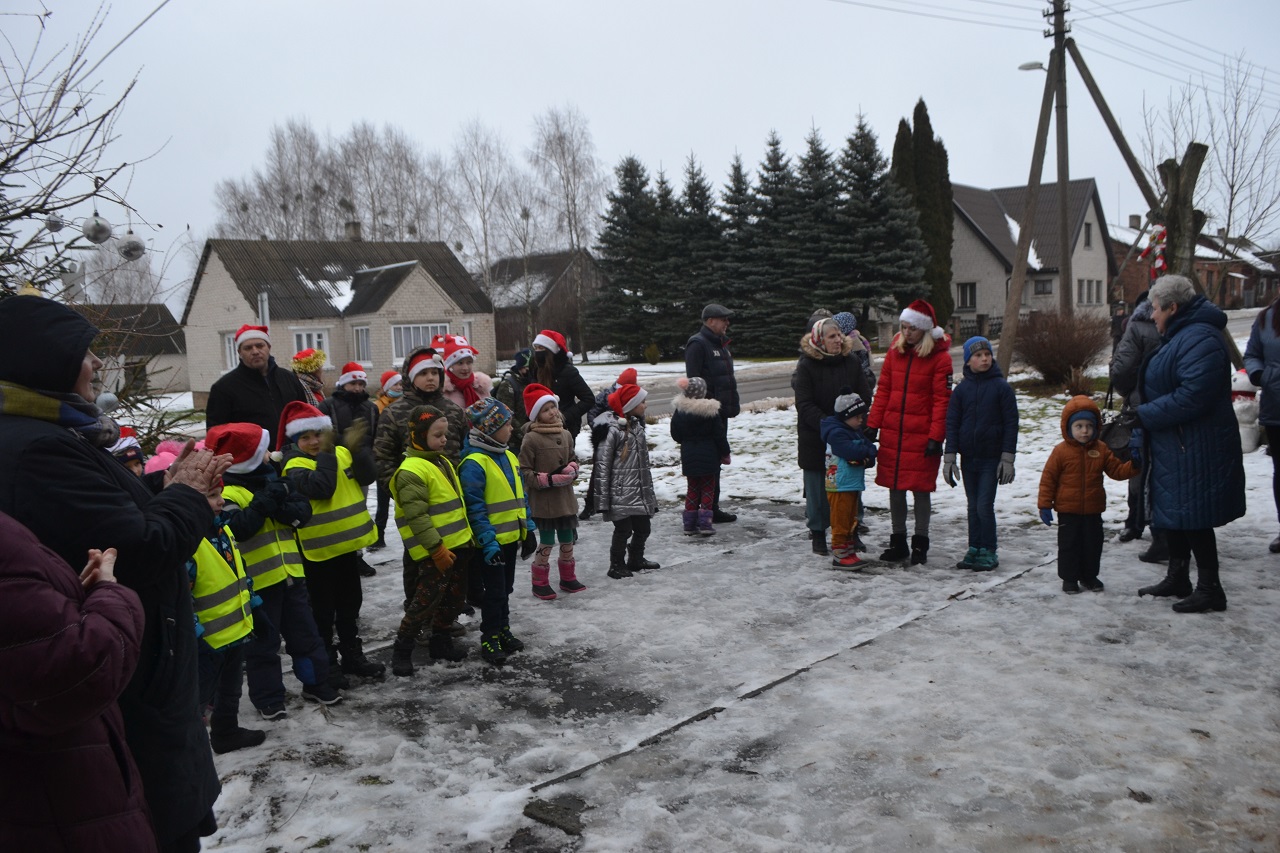 O vaikai džiaugėsi. Su Kalėdų seneliu, seniūne Birute, bendruomenės pirmininkė Jadvyga, klebonu Marium, auklėtoja Rita, dienos centro vadovais ir kitais Musninkų kaimo bendruomenės nariais ėjo ratelius, dainavo ir džiaugėsi artėjančiomis šventėmis.