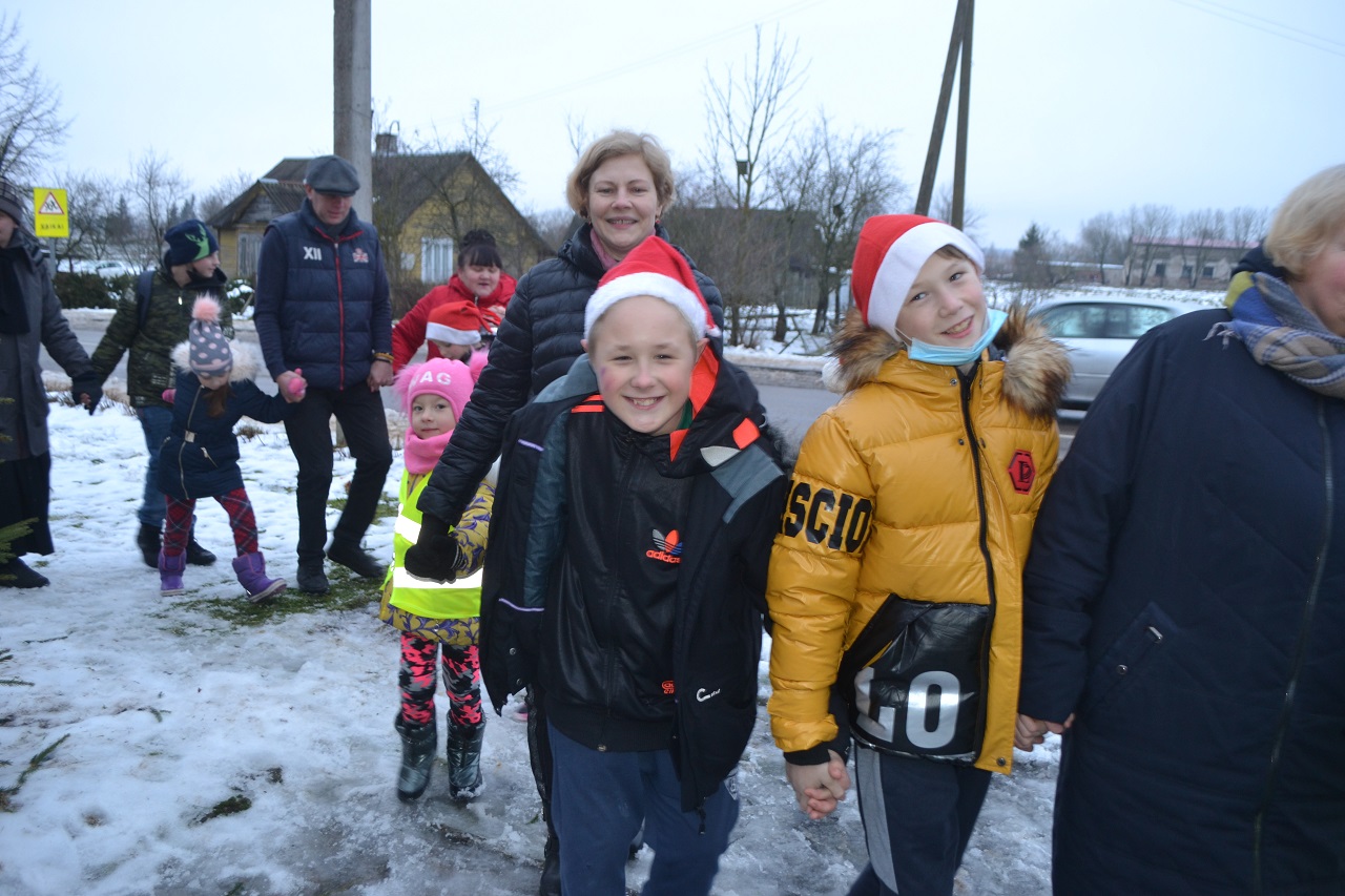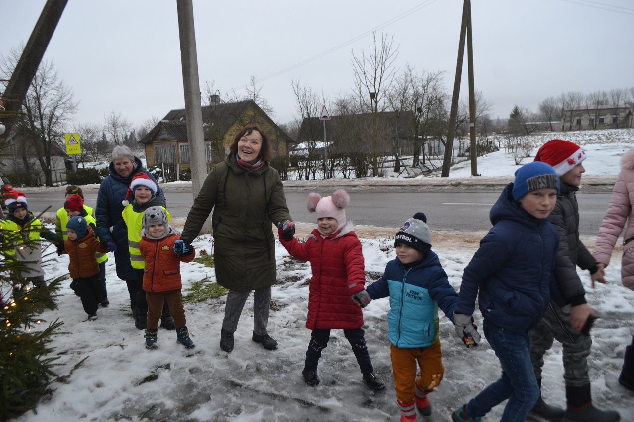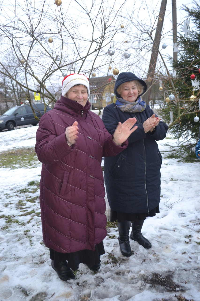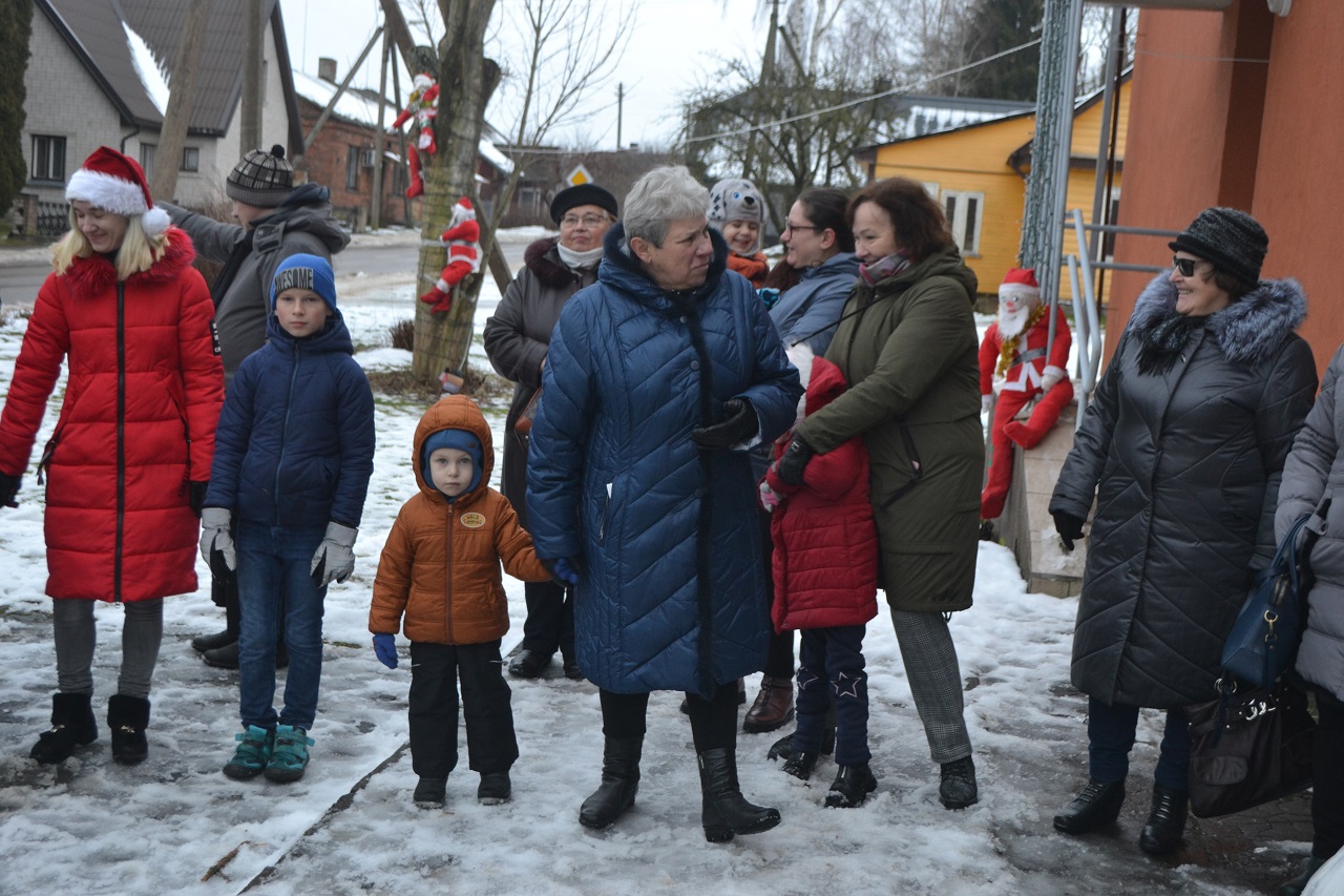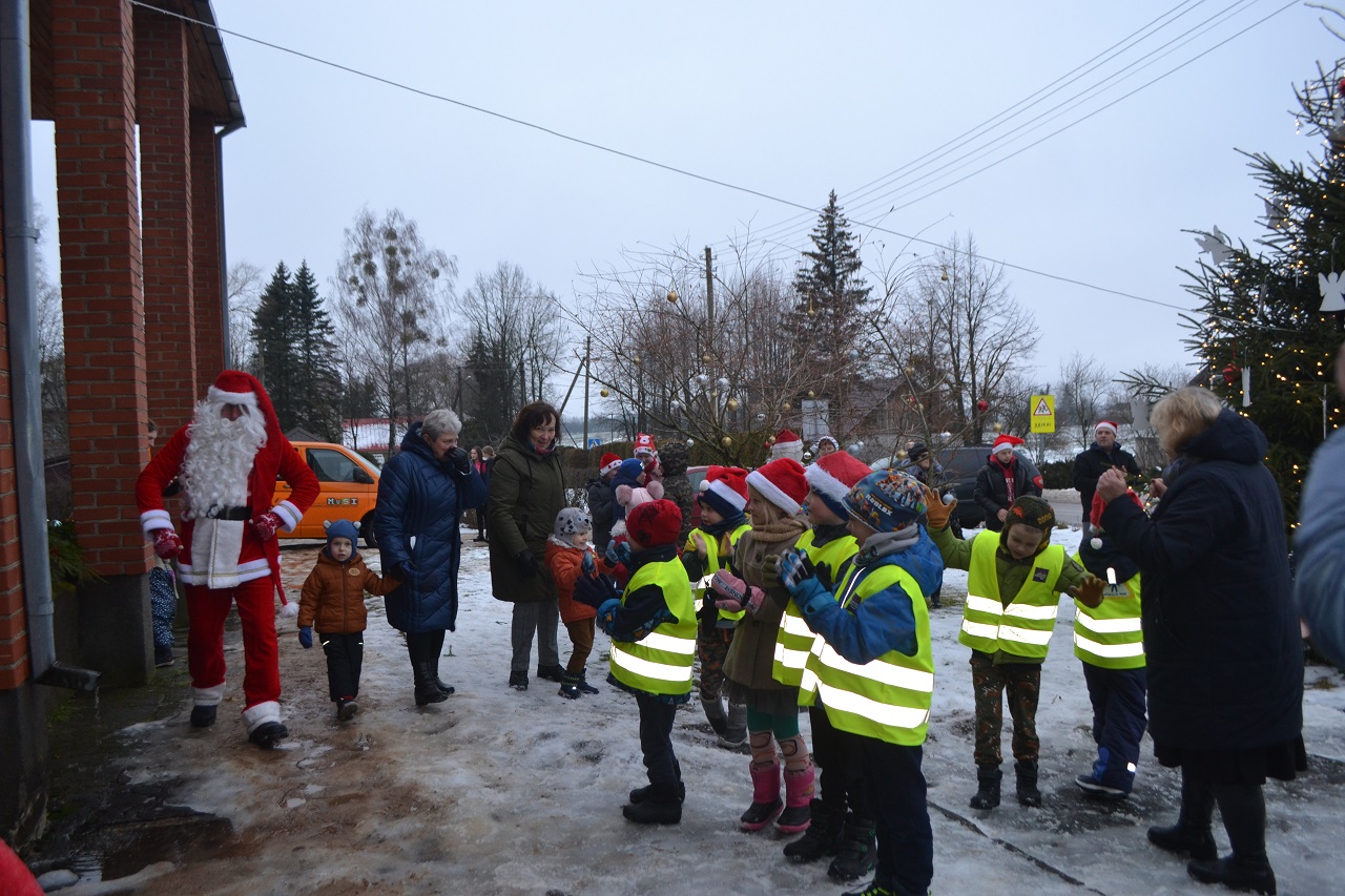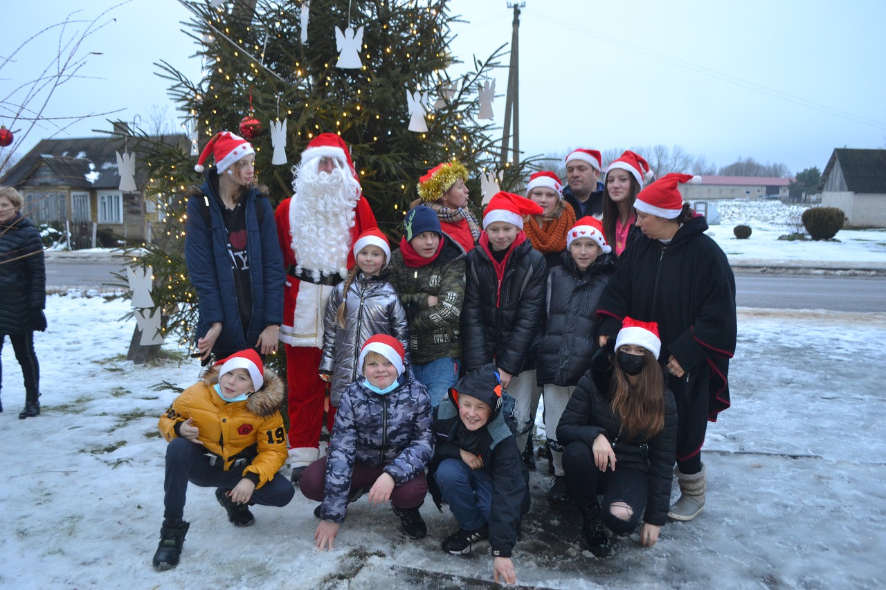 O vaikai džiaugėsi. Su Kalėdų seneliu, seniūne Birute, bendruomenės pirmininkė Jadvyga, klebonu Marium, auklėtoja Rita, dienos centro vadovais ir kitais Musninkų kaimo bendruomenės nariais ėjo ratelius, dainavo ir džiaugėsi artėjančiomis šventėmis.