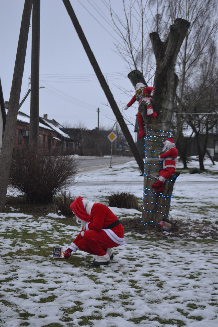 Kasrytą vaikams šviečia eglutė ir iš medžių moja Kalėdų seneliai, primindami, kad reikia būti geriems ir gražiai laukti švenčių.