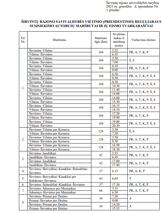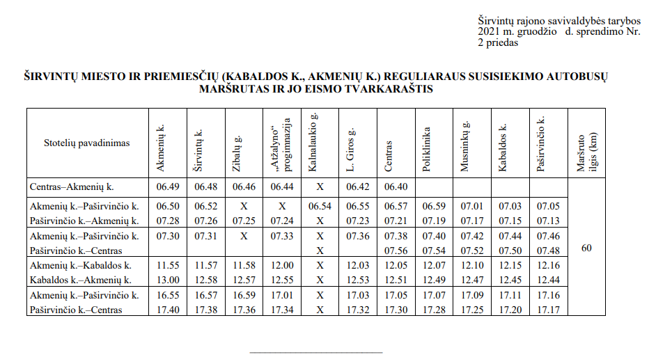 Širvintų rajono savivaldybės taryba sprendimu patvirtino naujus vietinio (priemiestinio) reguliaraus susisiekimo autobusų maršrutus ir jų eismo tvarkaraščius bei Širvintų miesto ir priemiesčių (Kabaldos k., Akmenių k.) reguliaraus susisiekimo autobusų maršrutą ir jo eismo tvarkaraštį.