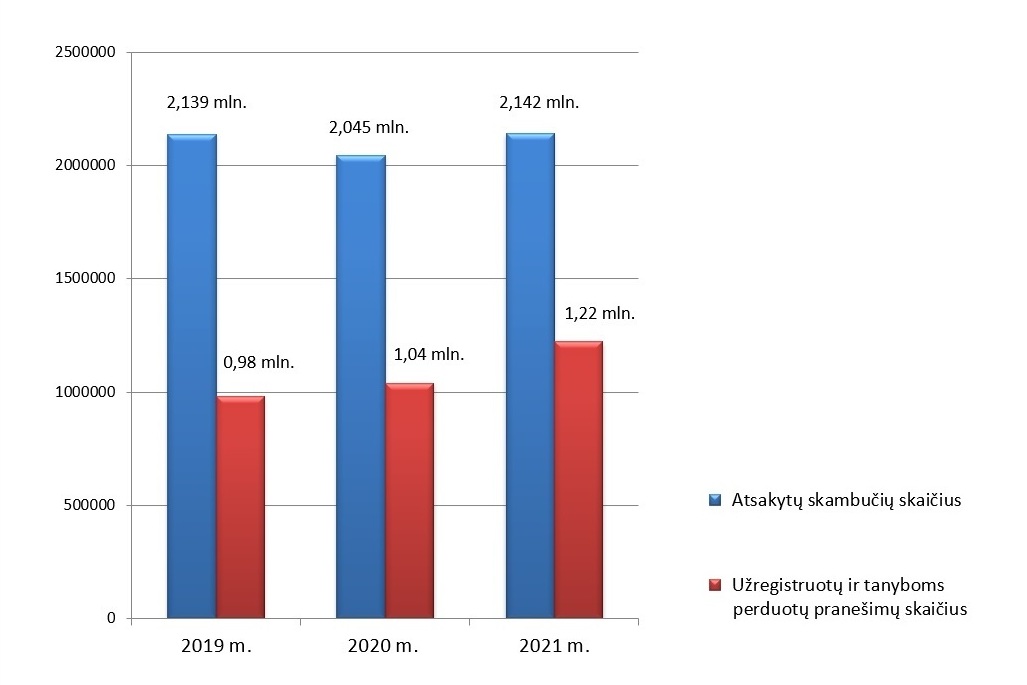 Nors pastebimai išaugo registruotų ir pagalbos tarnyboms perduotų pranešimų skaičius, atsiliepimo laikas nenukentėjo. Vidutinis atsiliepimo laikas kaip ir anksčiau siekė 5 sekundes, o per 15 sekundžių buvo atsiliepiama į 91,6 procento skambučių (2020 metais – 91,1 procento).