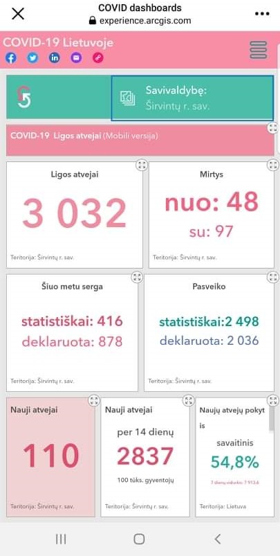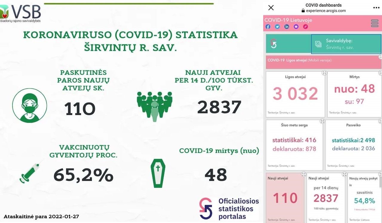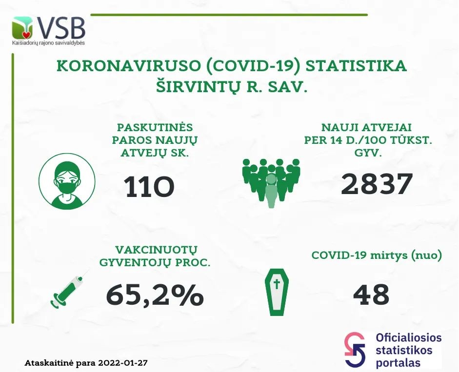 Prieš savaitgalį Širvintų rajone registruota 110 naujų covid-19 susirgimo atvejų. Statistiškai šiuo metu rajone serga 416 asmenų. Viso Širvintų rajone jau persirgo 3032 asmenys. Nuo šios ligos mirė 48, dėl kitų ligų mirė, bet kartu ir buvo diagnozuotas covid-19 devyniasdešimt septyniems asmenims.