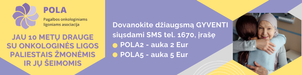 POLA nuolat dirba, kad su onkologine liga susidūrusiems žmonėms ir jų šeimoms atsivertų daugiau galimybių – kviečiame paaukoti ir paremti POLA veiklą. Paprasčiausia aukoti siunčiant SMS trumpuoju numeriu 1670, įrašant POLA2 – auka 2 Eur, POLA5 – auka 5 Eur. Dėkojame!