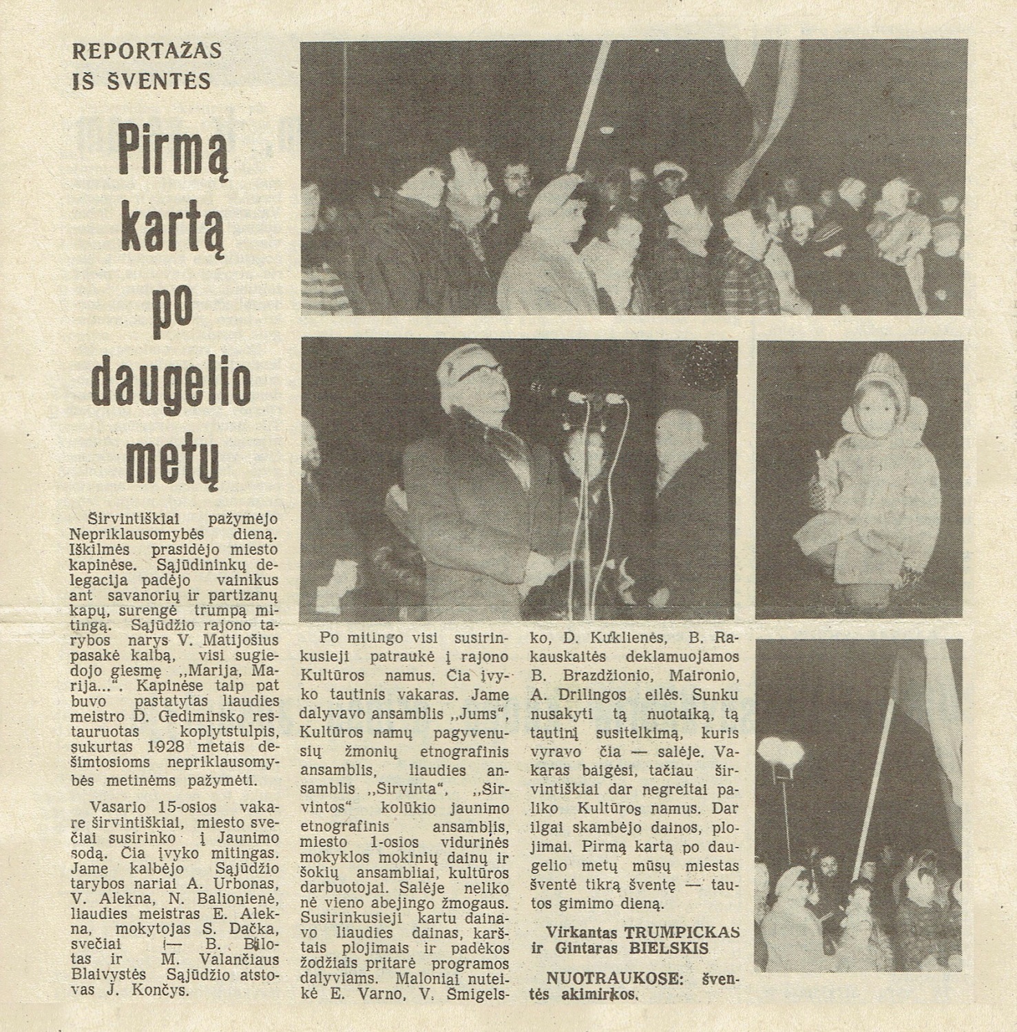 “Širvintiškiai pažymėjo Nepriklausomybės dieną. Iškilmės prasidėjo miesto kapinėse. Sąjūdininkų delegacija padėjo vainikus ant savanorių ir partizanų kapų, surengė trumpą mitingą. Sąjūdžio rajono tarybos narys V. Matijošius pasakė kalbą, visi sugiedojo giesmę „Marija, Marija…”. Kapinėse taip pat buvo pastatytas liaudies meistro D. Gediminsko restauruotas koplytstulpis, sukurtas 1928 metais dešimtosioms nepriklausomybės metinėms pažymėti.