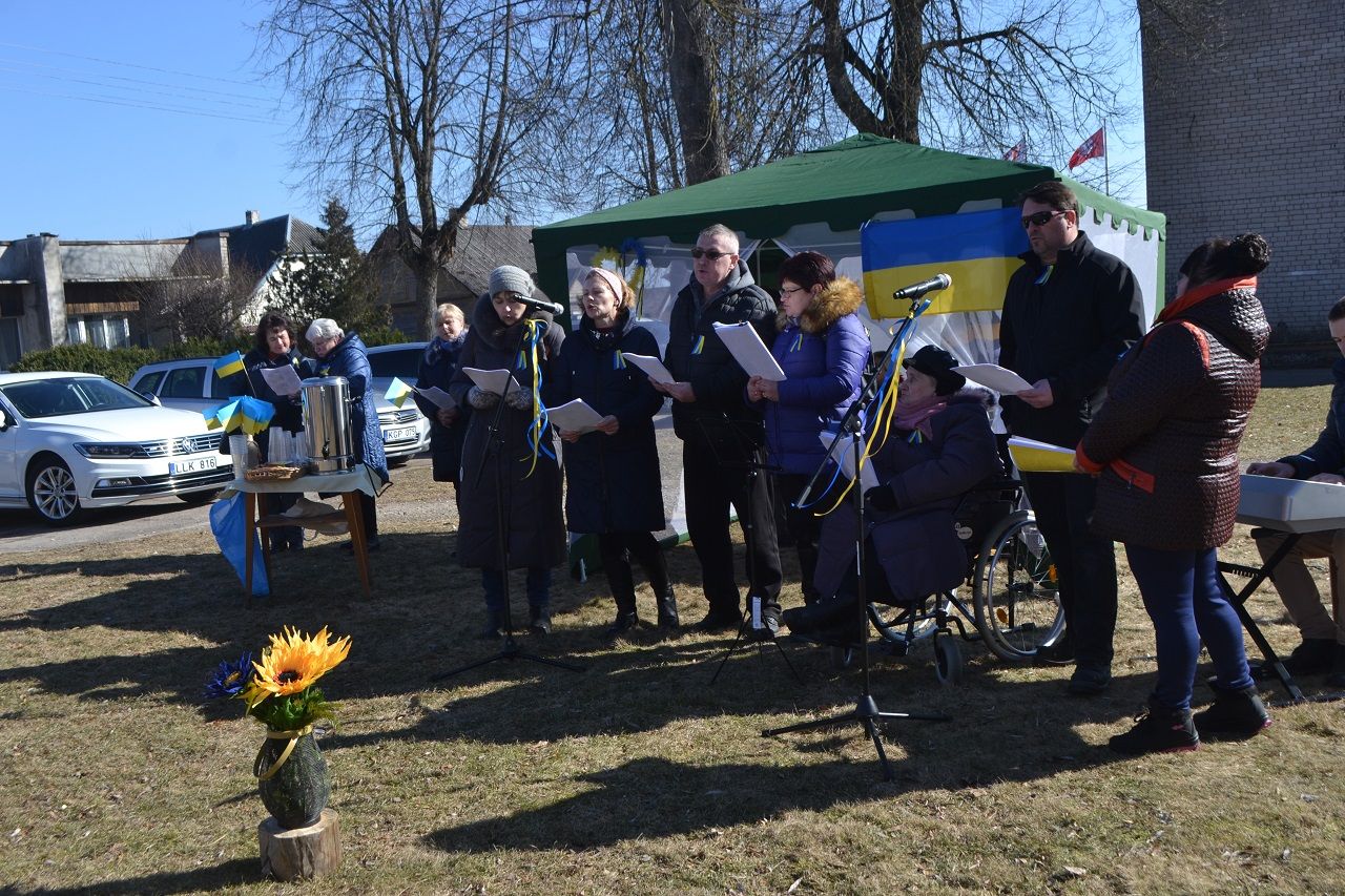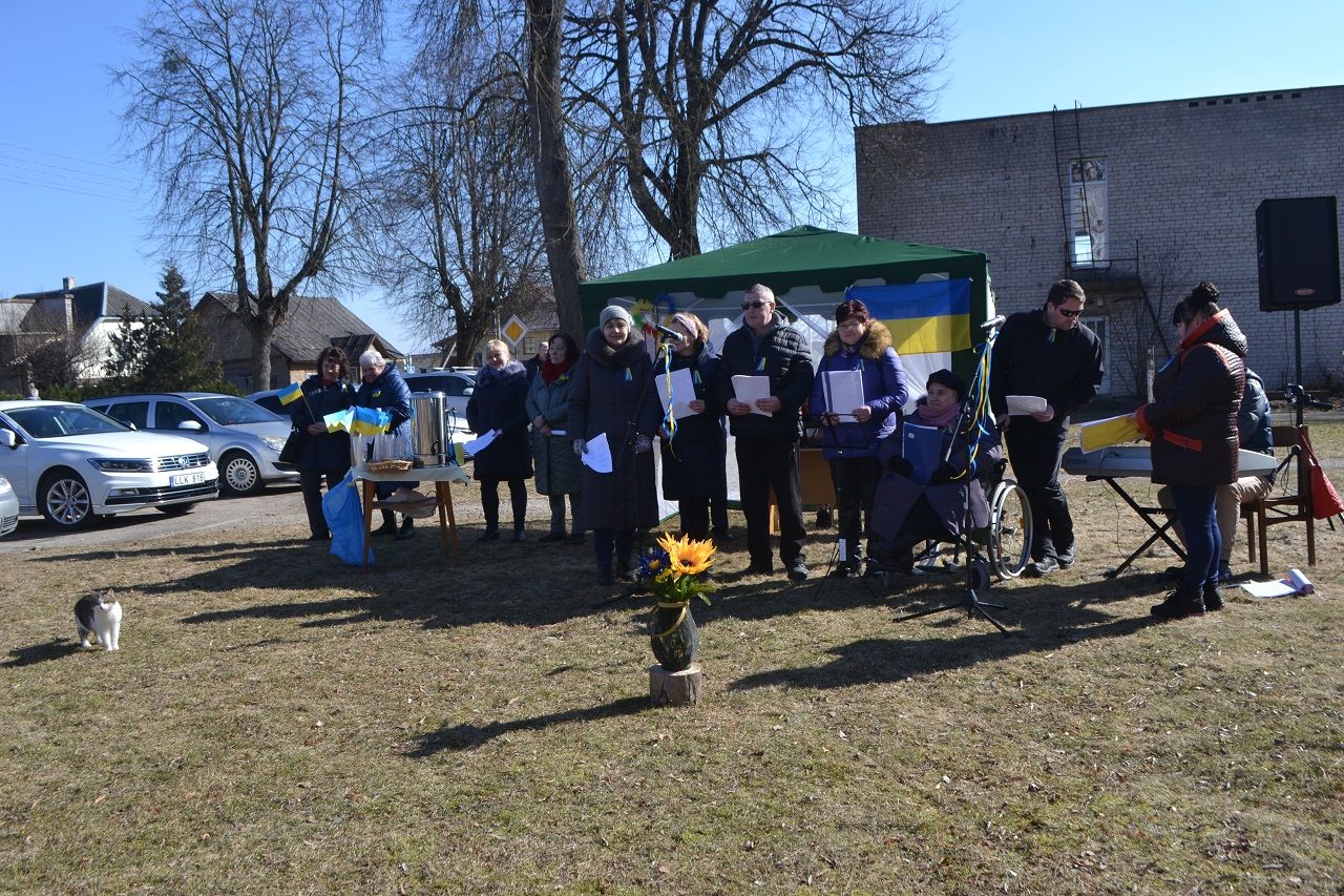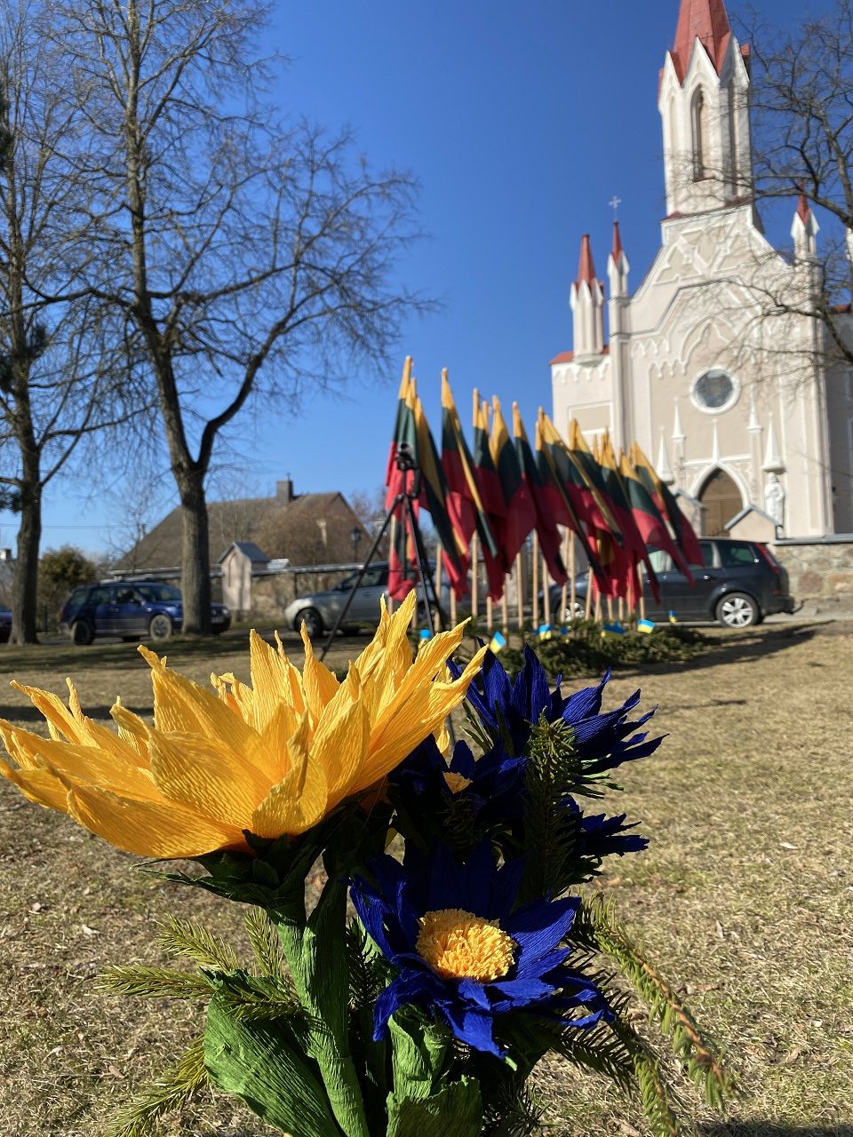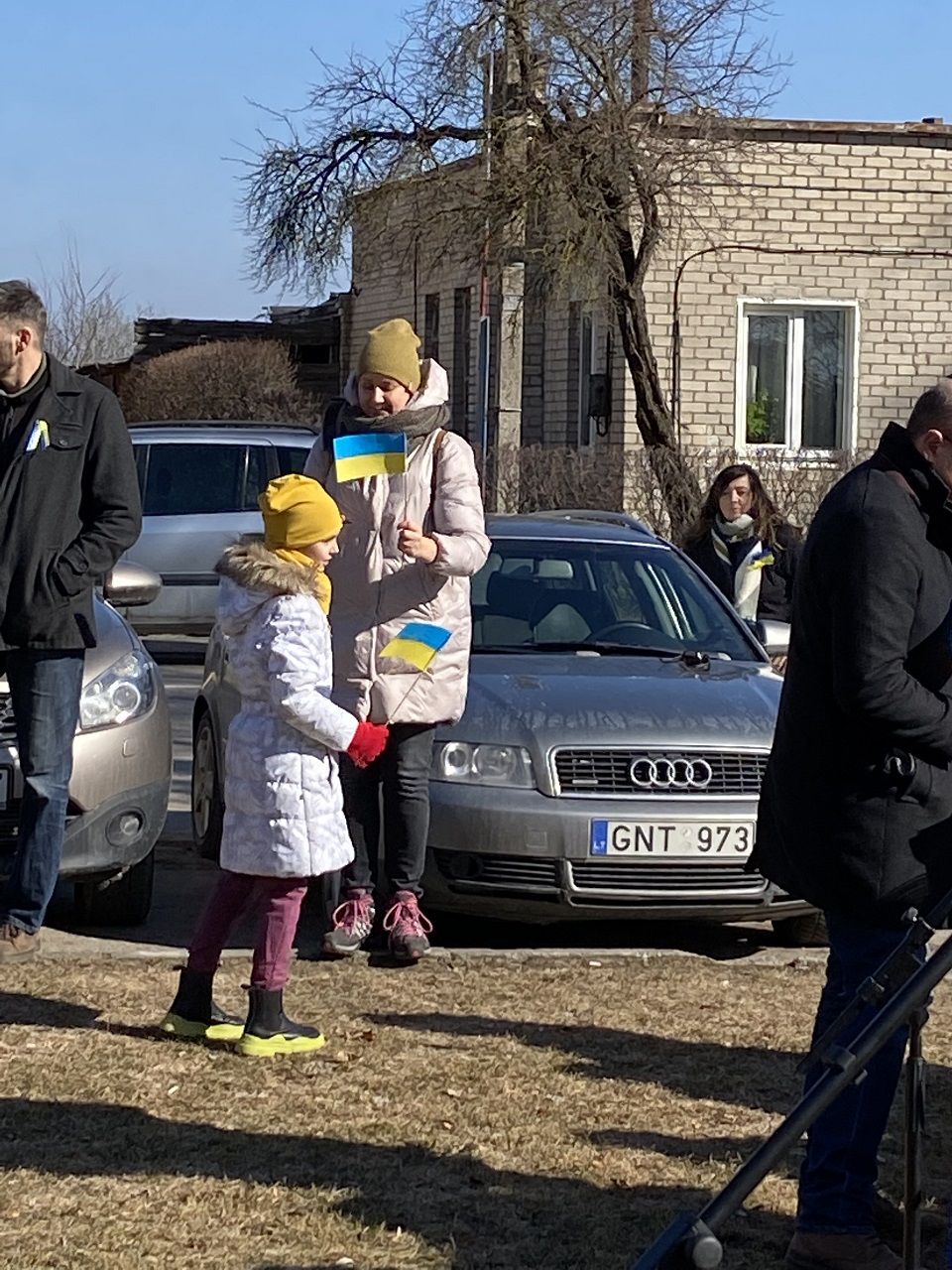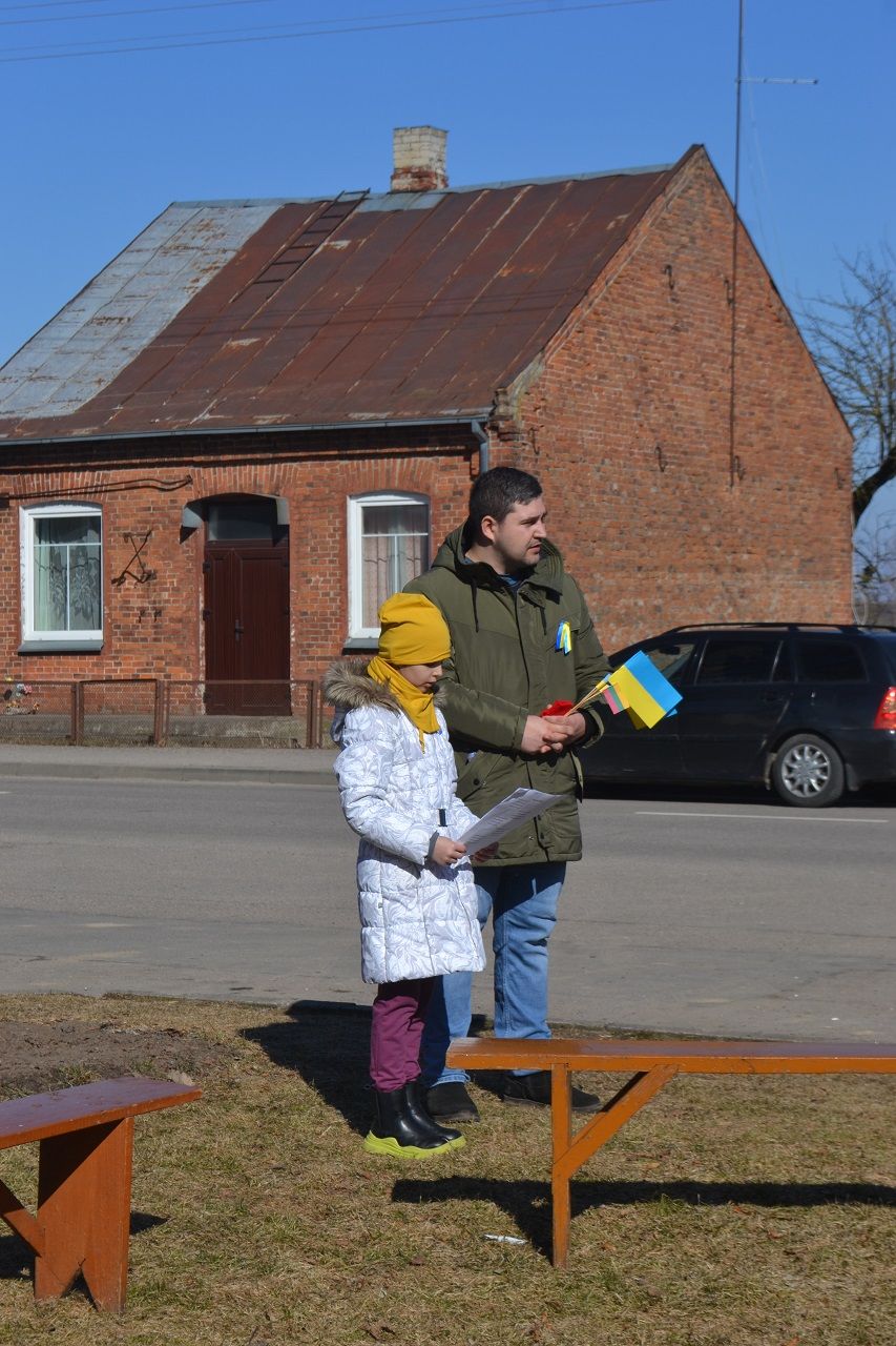 Akcijos dalyviams buvo dalijamos bendruomenės narių gamintos Ukrainos vėliavėlės, įsegti ženkliukai, kuriuos pagamino Jelena Masiukė.