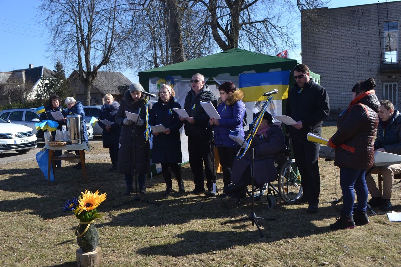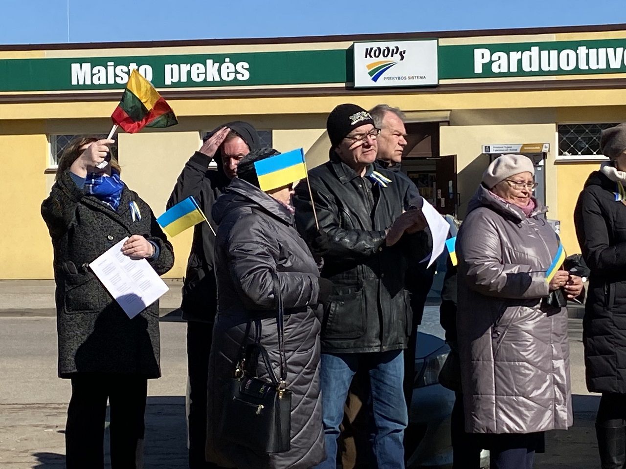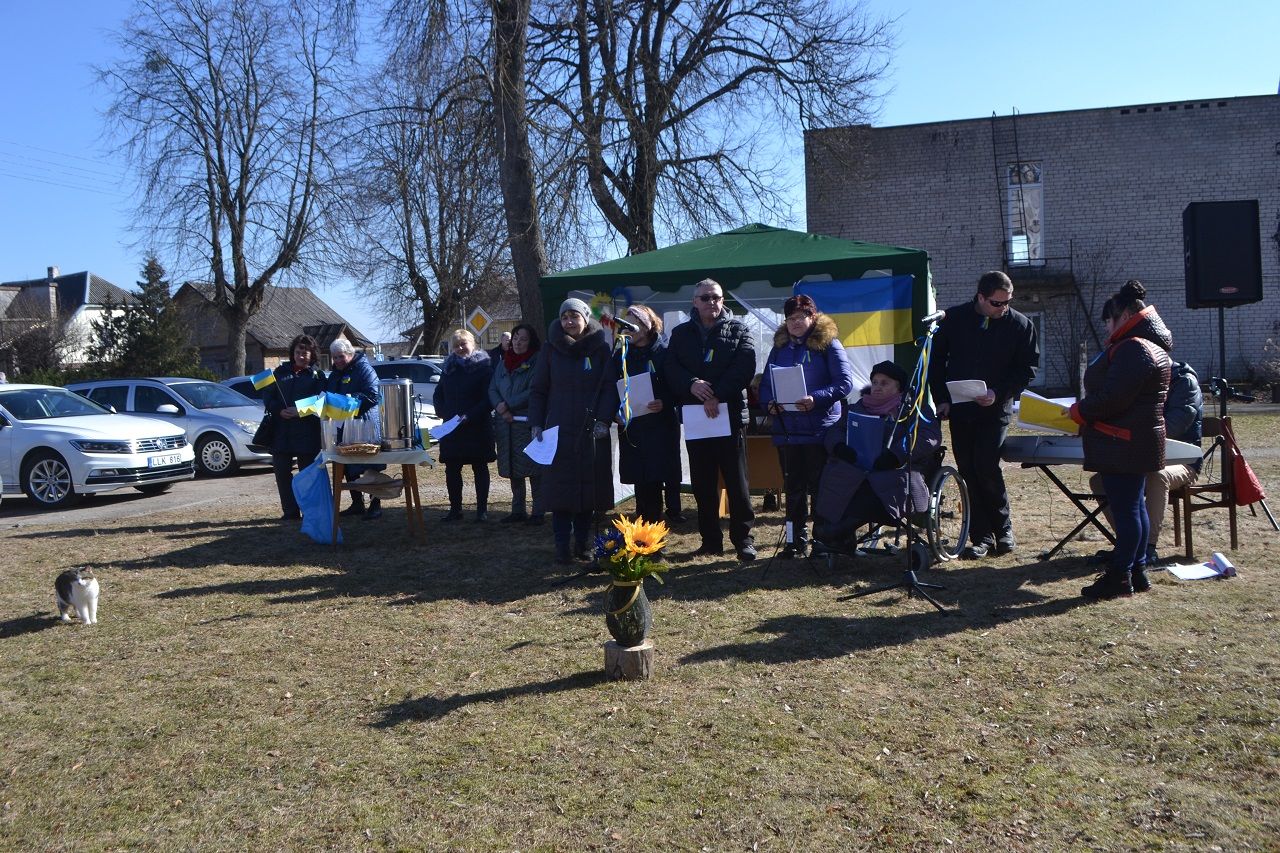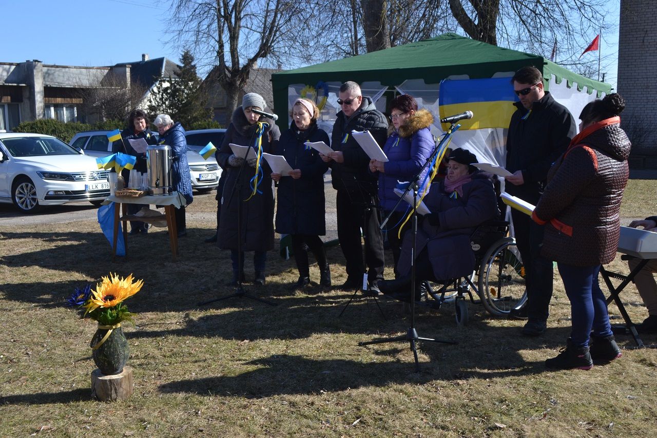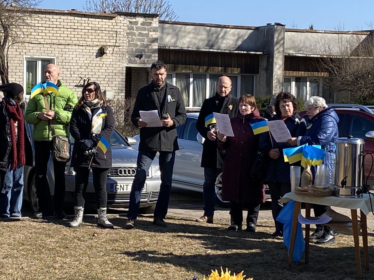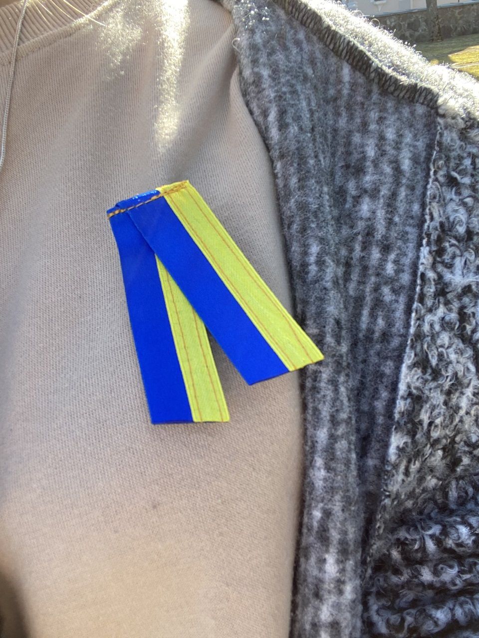 Akcijos dalyviams buvo dalijamos bendruomenės narių gamintos Ukrainos vėliavėlės, įsegti ženkliukai, kuriuos pagamino Jelena Masiukė.