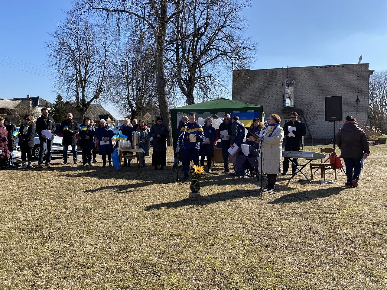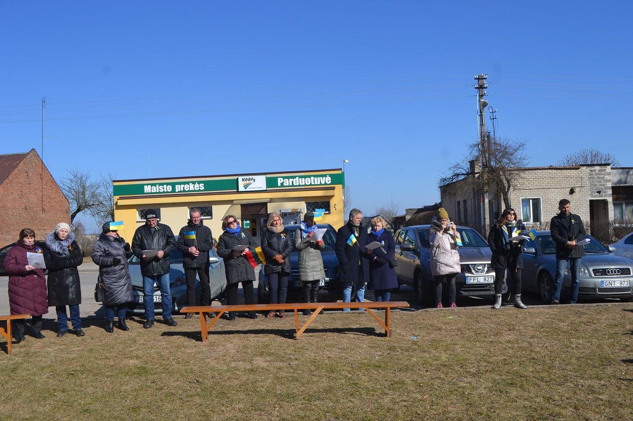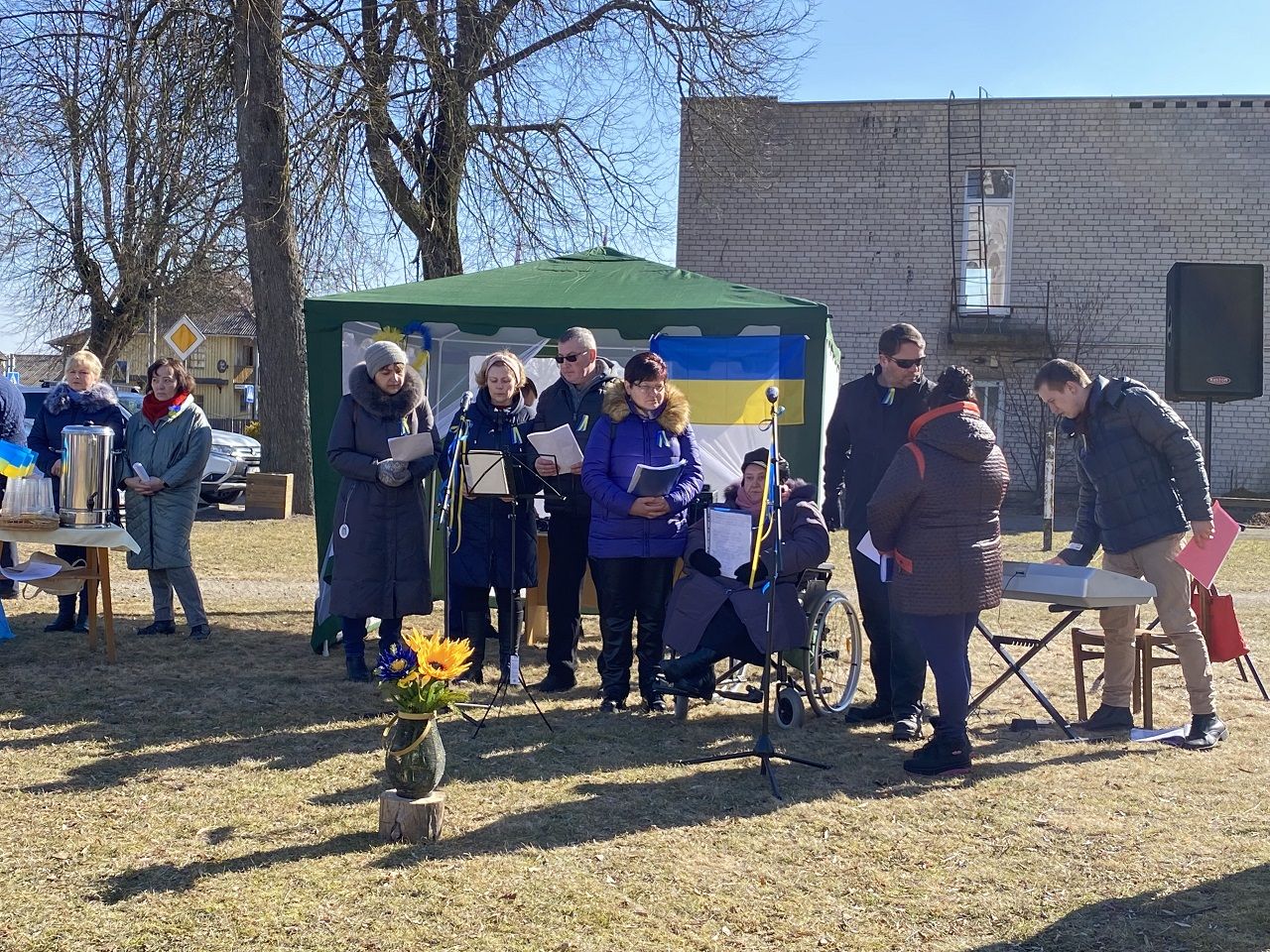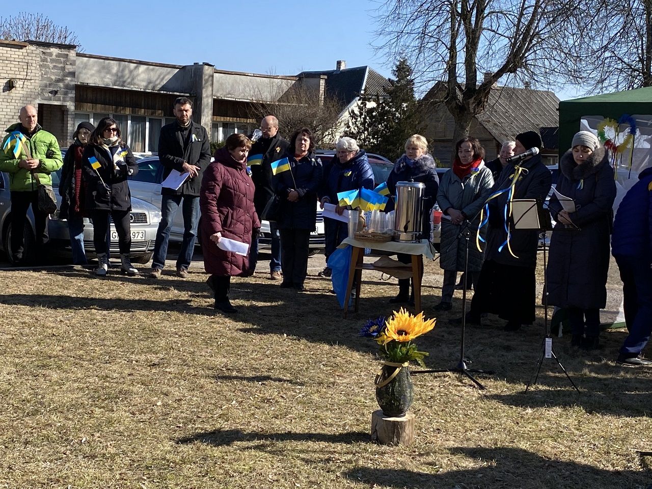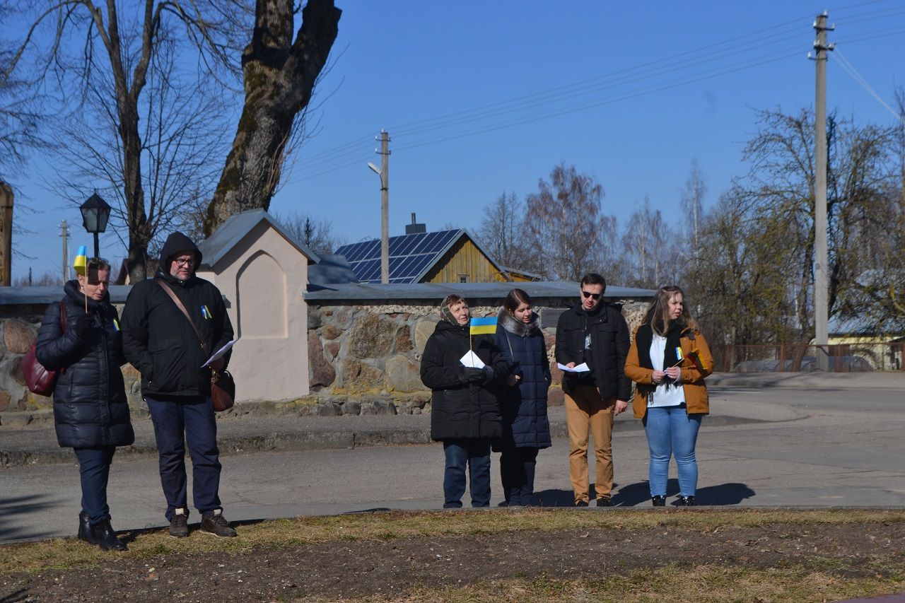 Akcijos dalyviams buvo dalijamos bendruomenės narių gamintos Ukrainos vėliavėlės, įsegti ženkliukai, kuriuos pagamino Jelena Masiukė.