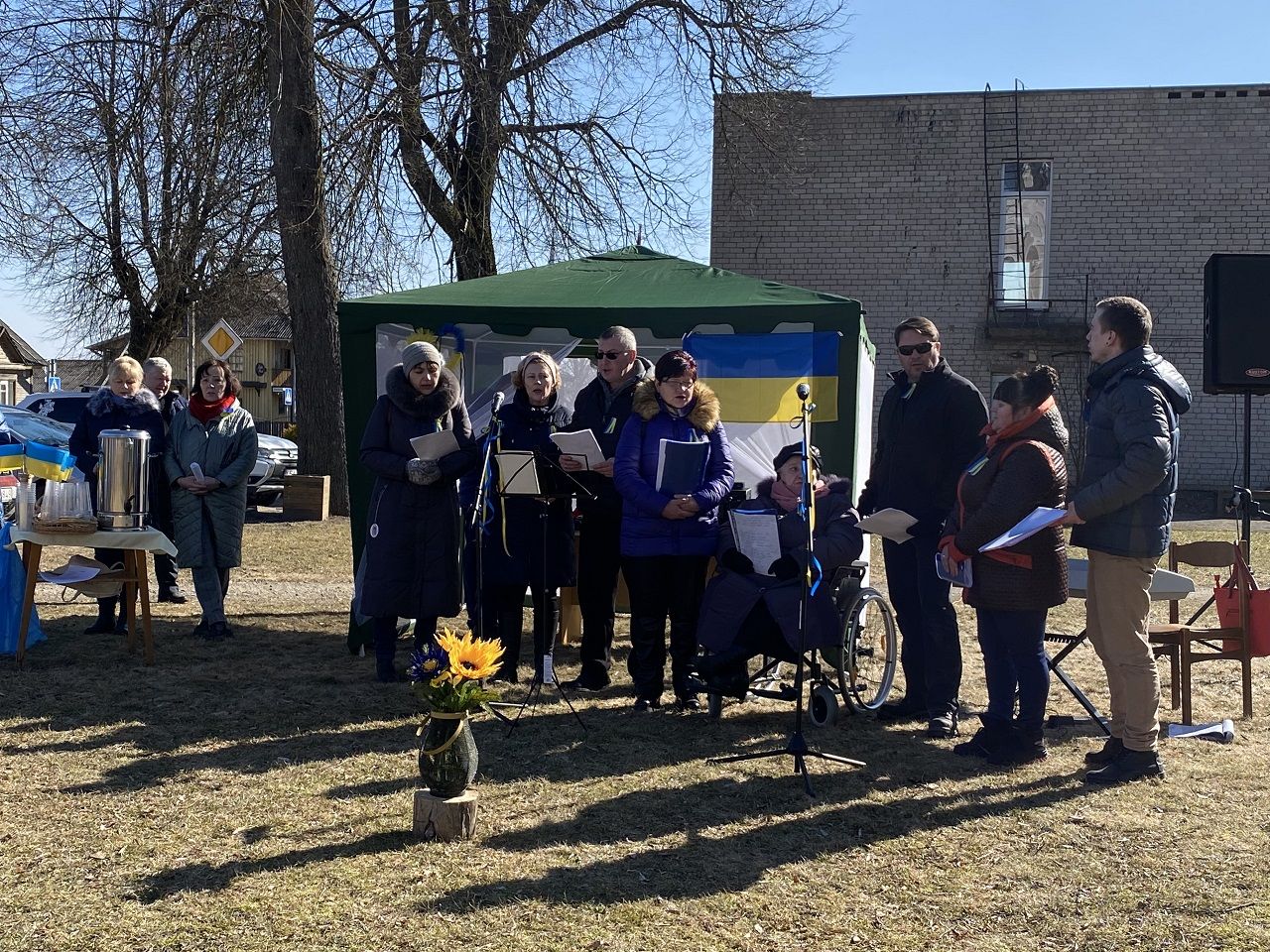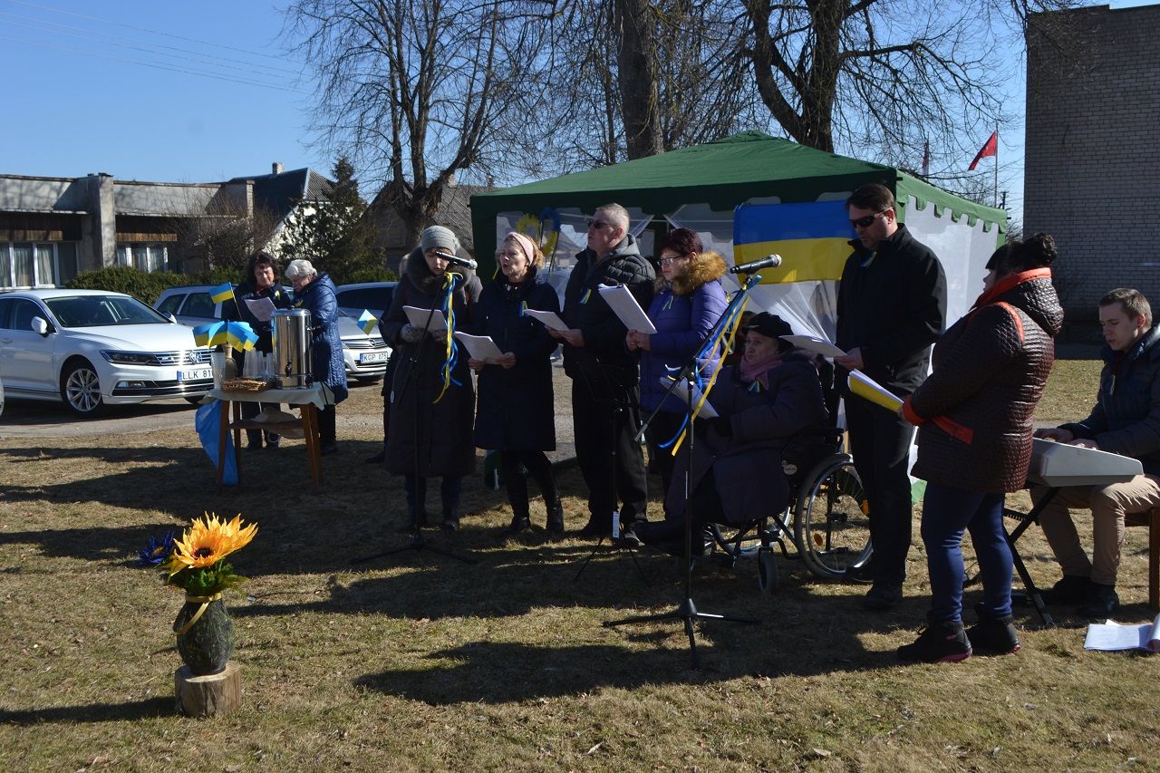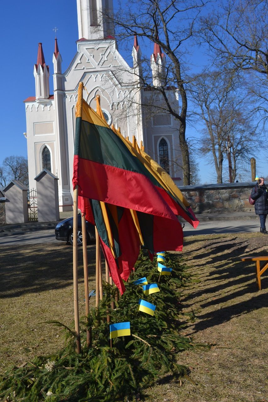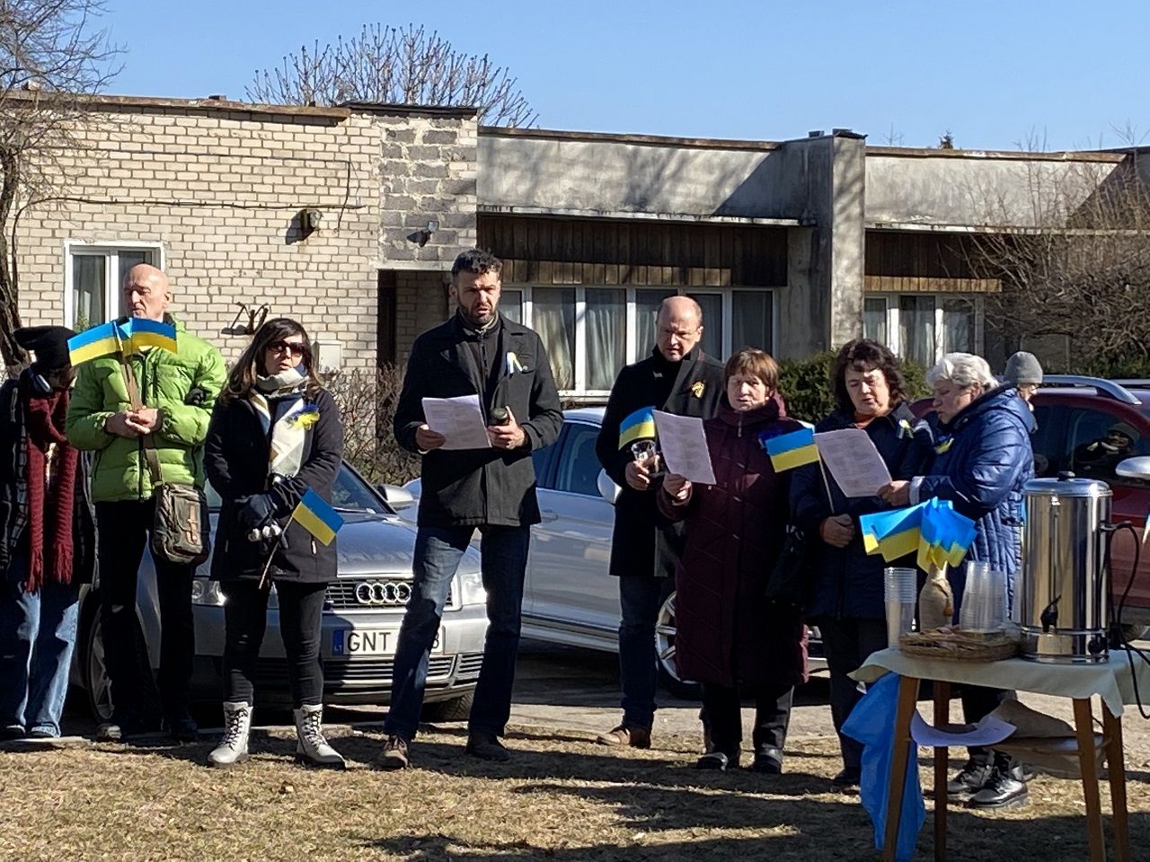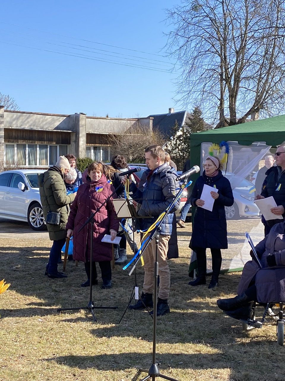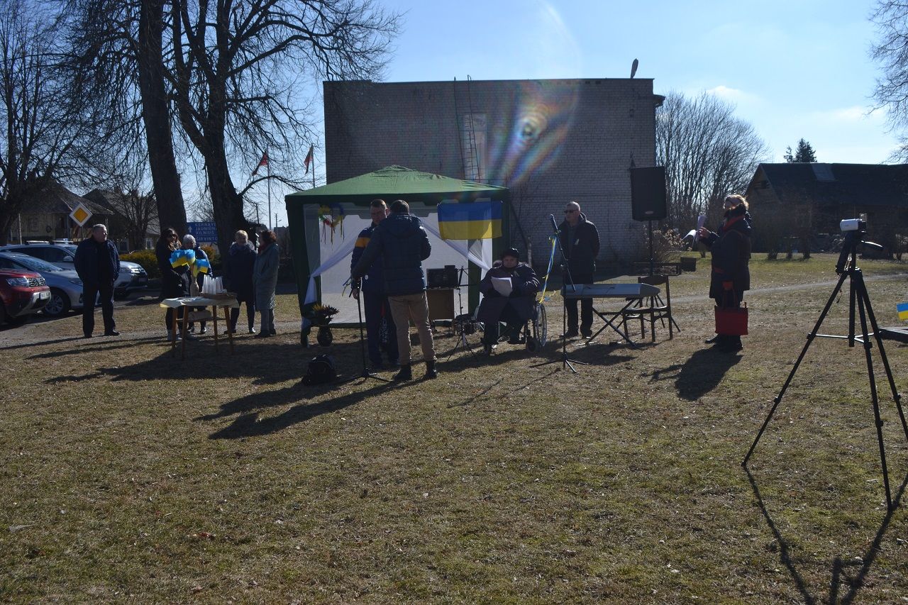 Akcijos dalyviams buvo dalijamos bendruomenės narių gamintos Ukrainos vėliavėlės, įsegti ženkliukai, kuriuos pagamino Jelena Masiukė.