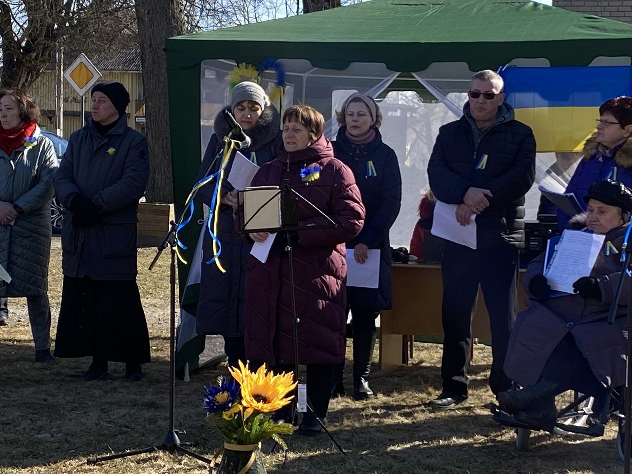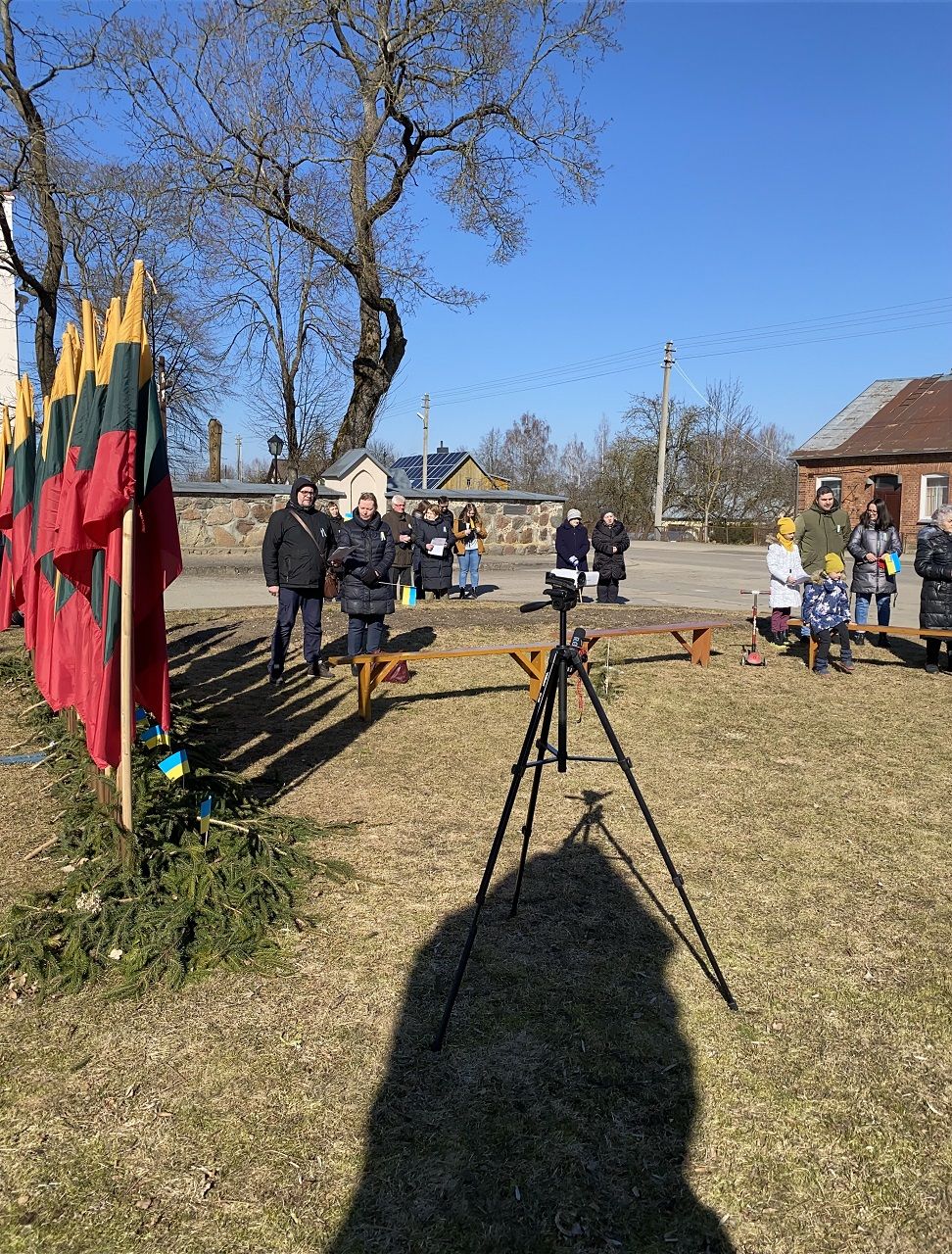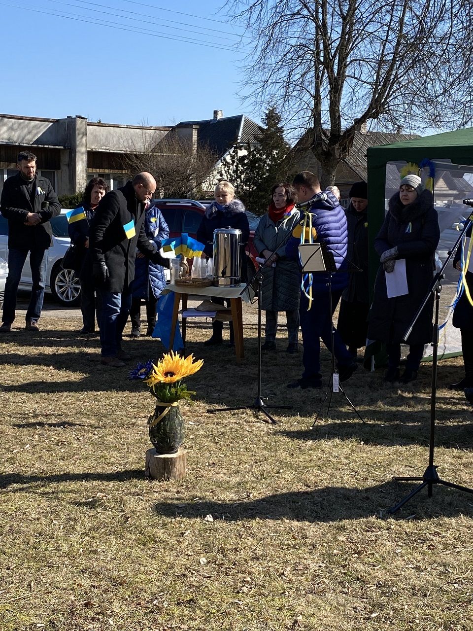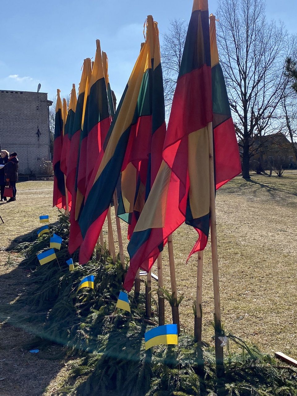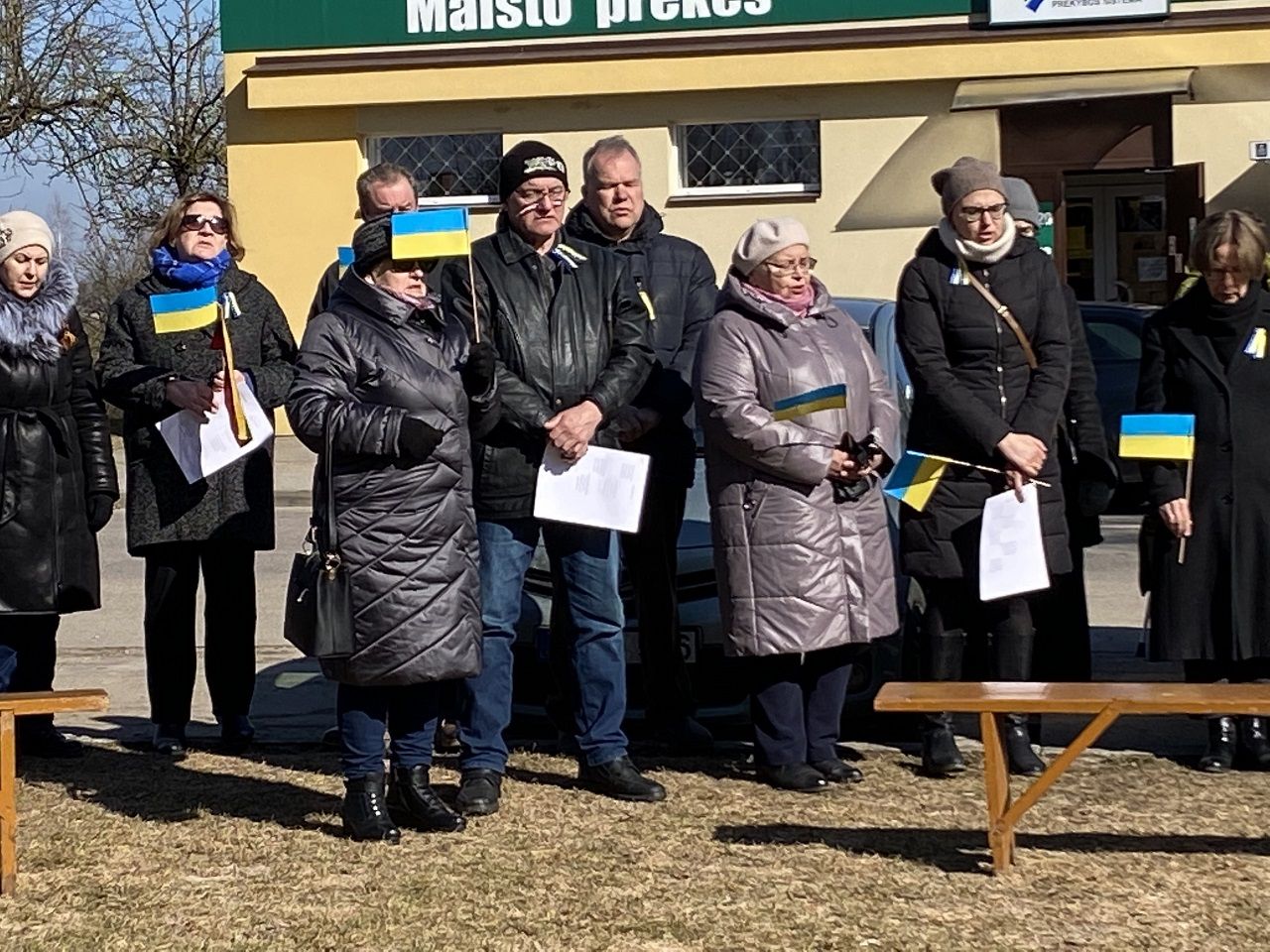 Akcijos dalyviams buvo dalijamos bendruomenės narių gamintos Ukrainos vėliavėlės, įsegti ženkliukai, kuriuos pagamino Jelena Masiukė.