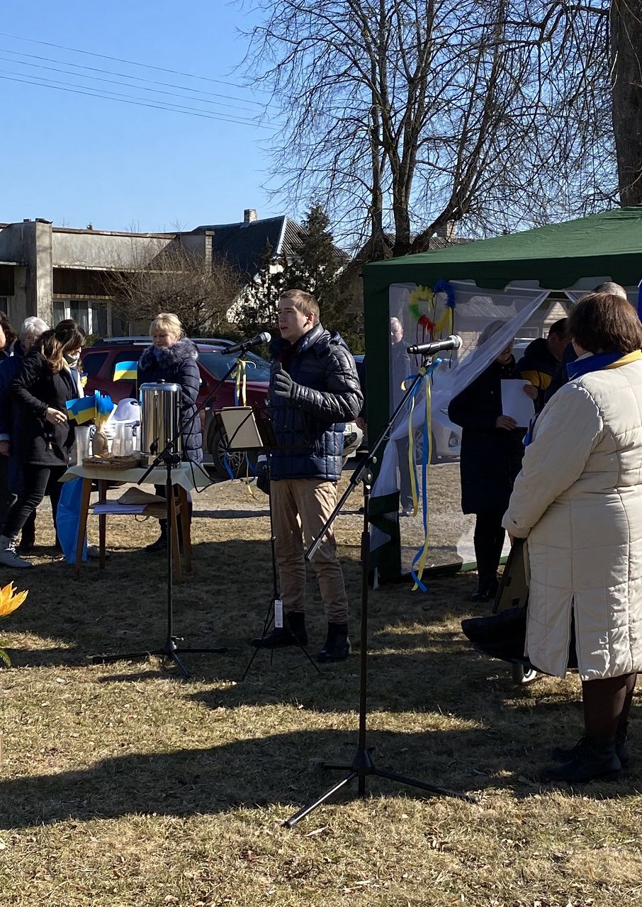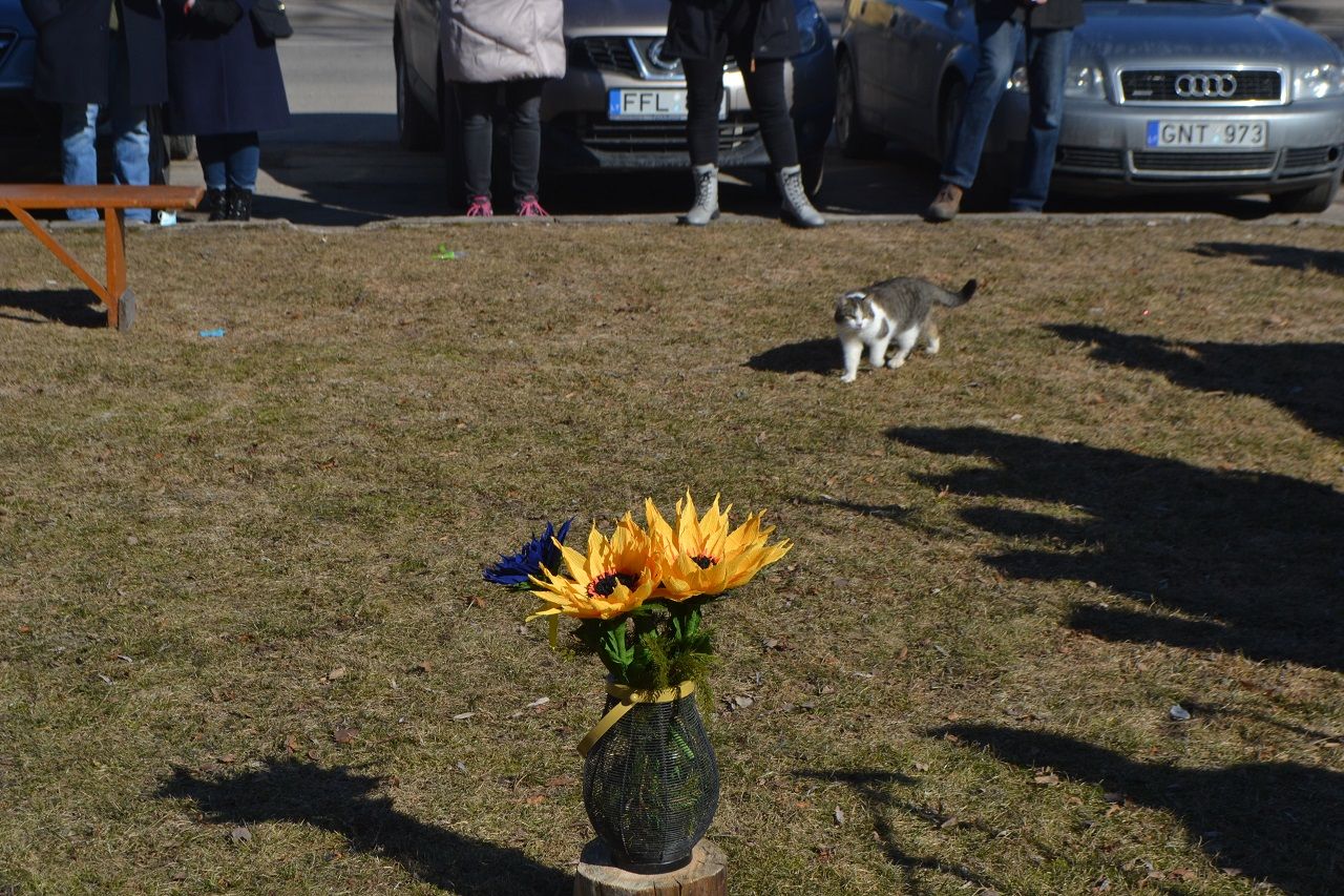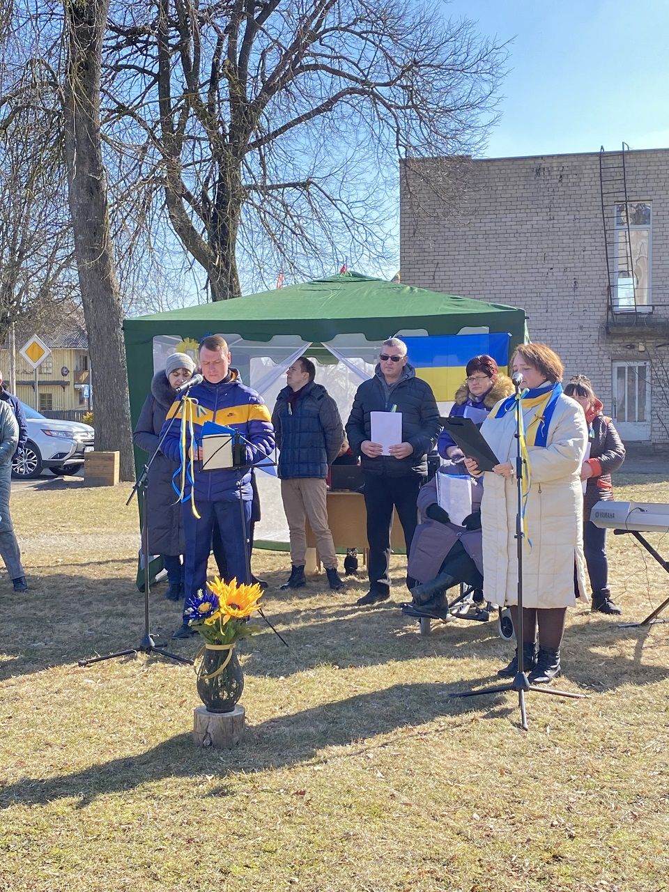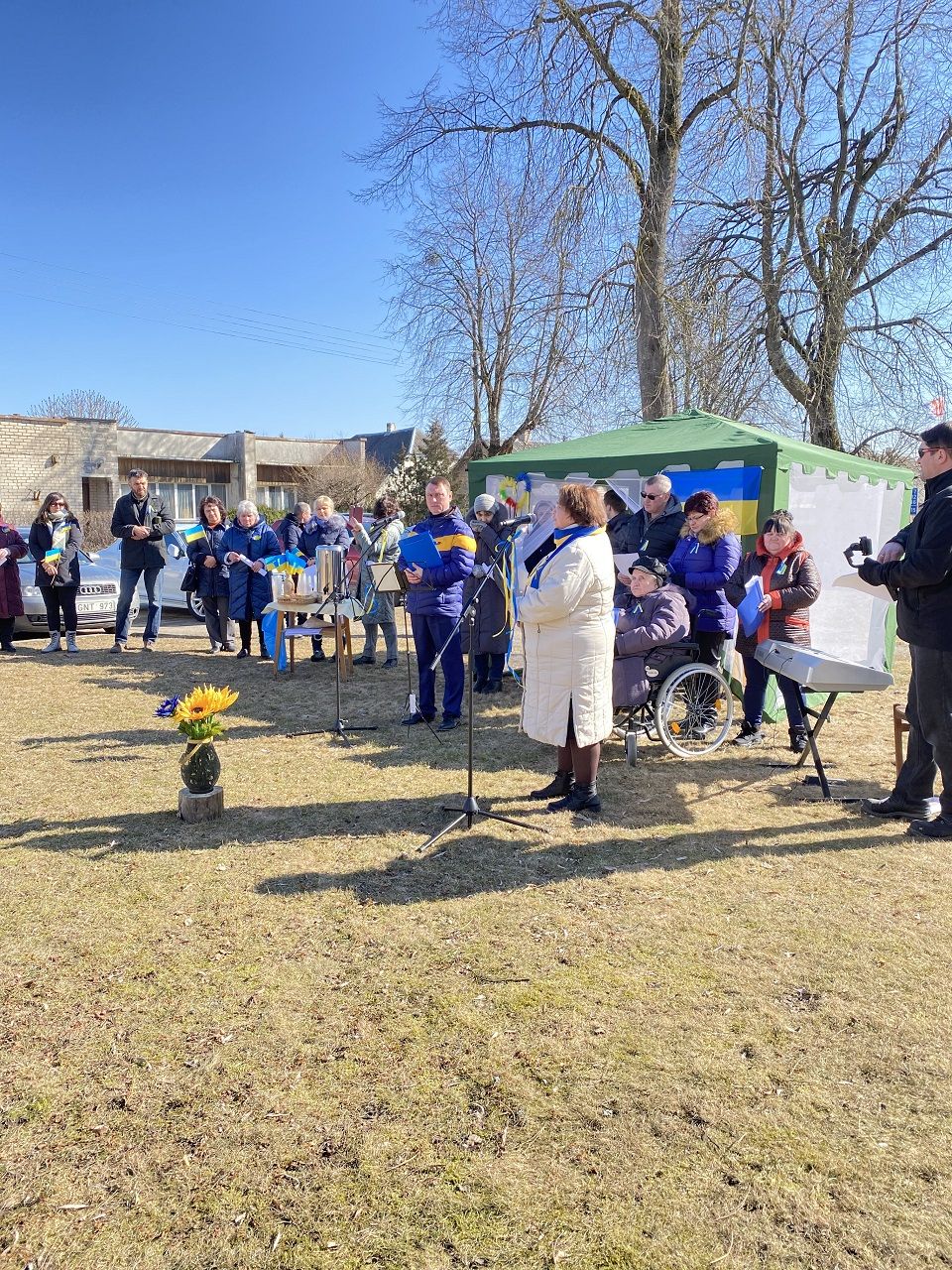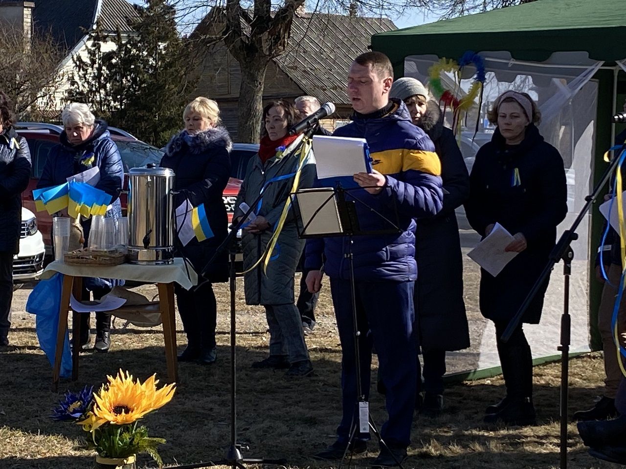 Akcijos dalyviams buvo dalijamos bendruomenės narių gamintos Ukrainos vėliavėlės, įsegti ženkliukai, kuriuos pagamino Jelena Masiukė.