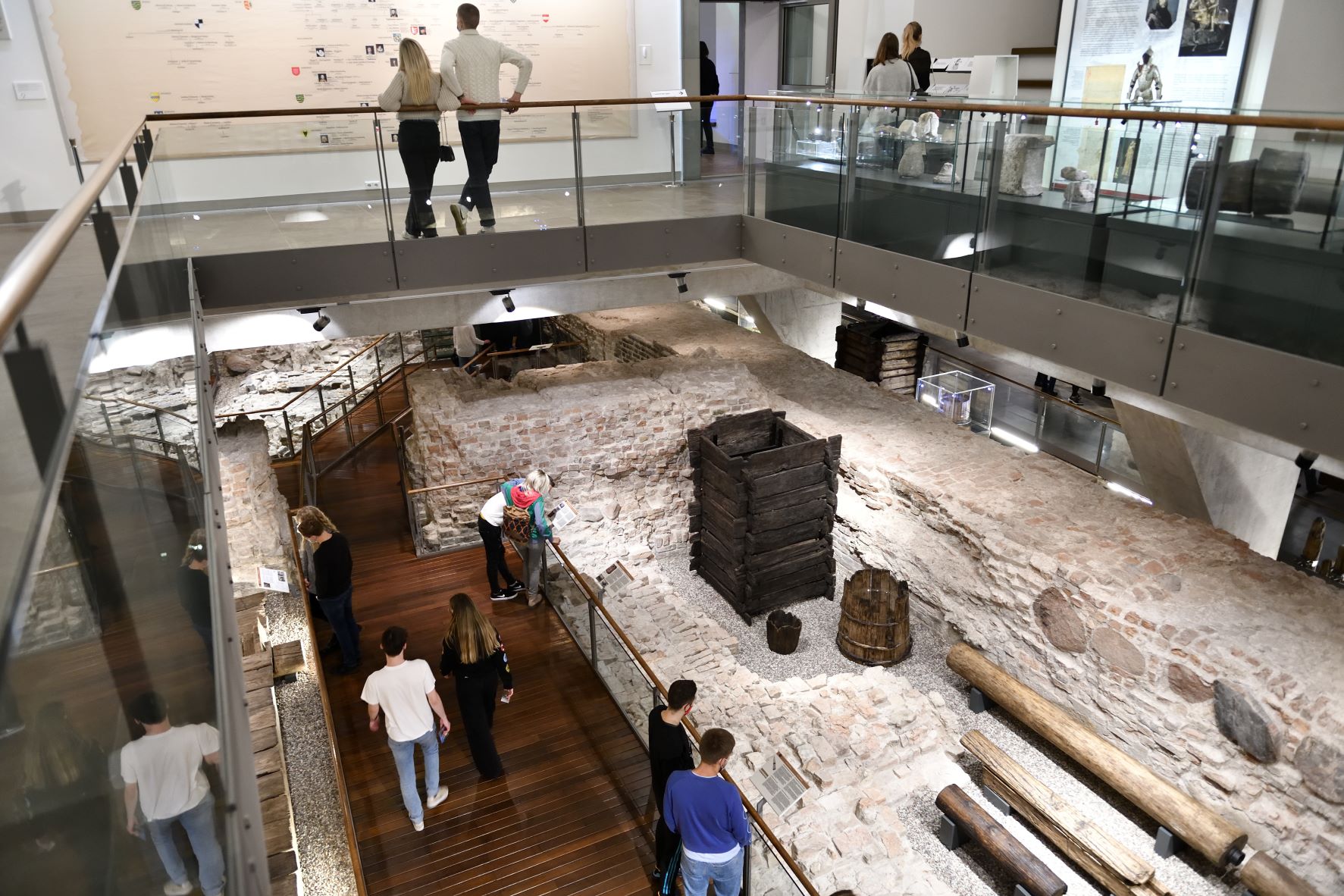 Archeologijos ekspozicijoje – naujausi restauruoti radiniai, aptikti per Valdovų rūmų teritorijos archeologinius kasinėjimus. Keletą šimtmečių Rusijos ordų niokotus Valdovų rūmus ir gyvenimą juose tenka atkurti kantriai restauruojant kiekvieną šukę. Šiandien archeologų, restauratorių ir istorikų dėka žinome, kad jau XIII a. pabaigoje ant valdovo ir didikų stalo stovėjo paauksuotos stiklo taurės iš Artimųjų Rytų – greičiausiai iš Sirijos stiklo dirbtuvių. Lietuvos didžiojo kunigaikščio aplinkos žmonės dabinosi papuošalais iš tauriųjų metalų ir brangakmenių (seniausias auksinis žiedas, datuojamas XIII a. aštuntuoju dešimtmečiu), vaikščiojo avėdami elegantiškais, spalvingais batais.