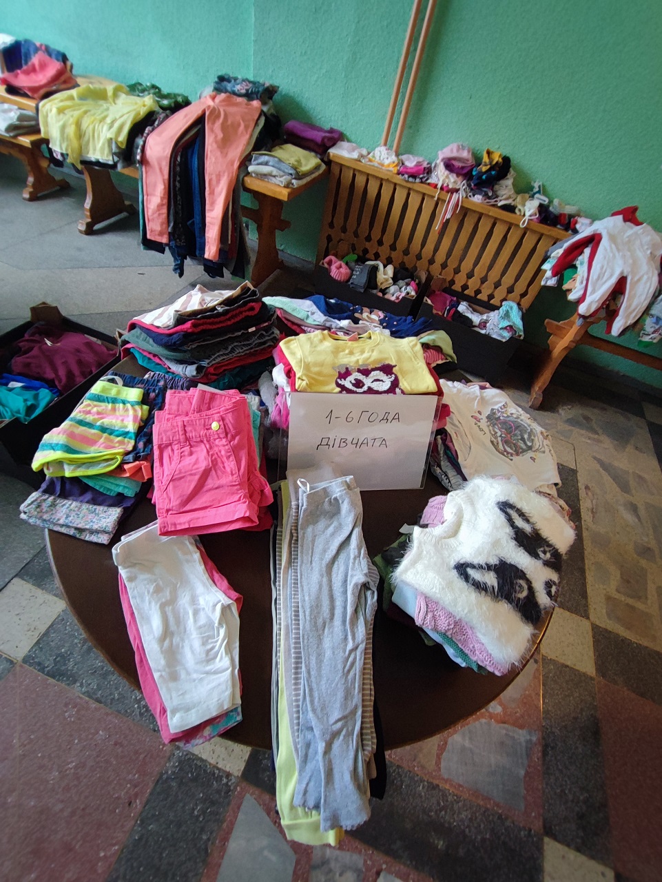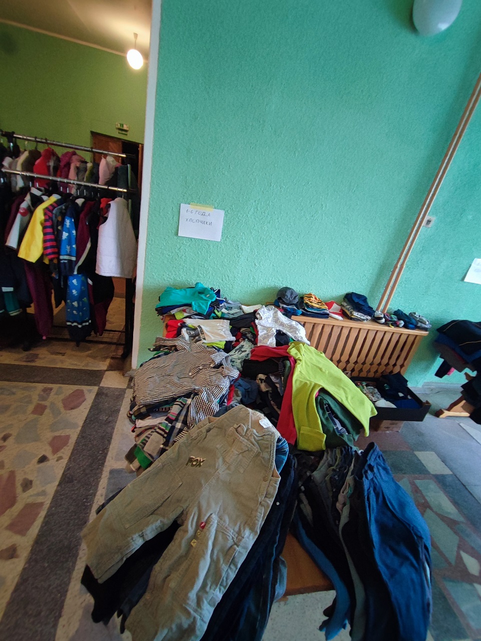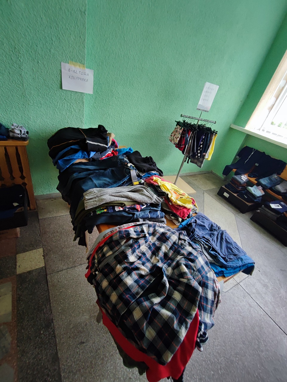 Susitinkame senajame Širvintų baseine. Kieme lyja, tad ir lankytojų nėra. Čia patalpomis naudotis leido Širvintų rajono savivaldybės administracija. Aplink begalės kabyklų su sukabintais drabužiais (kabyklas paskolino „Viktorijos“ savininkas Rimantas Šimonis).   Drabužių dar prilankstyta ant stalų ir lentynų, sudėliota avalynė, prie žaislų patiestas kilimėlis – kol mama renka drabužius, vaikas gali pažaisti ir pasiimti patikusį žaislą ar žaidimą.