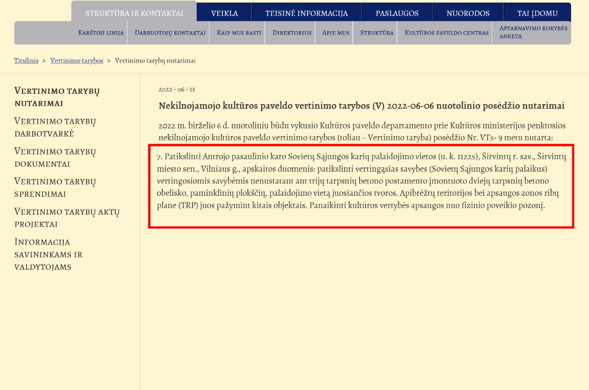 Nekilnojamojo kultūros paveldo vertinimo tarybos (V) 2022-06-06 nuotolinio posėdžio nutarimai: