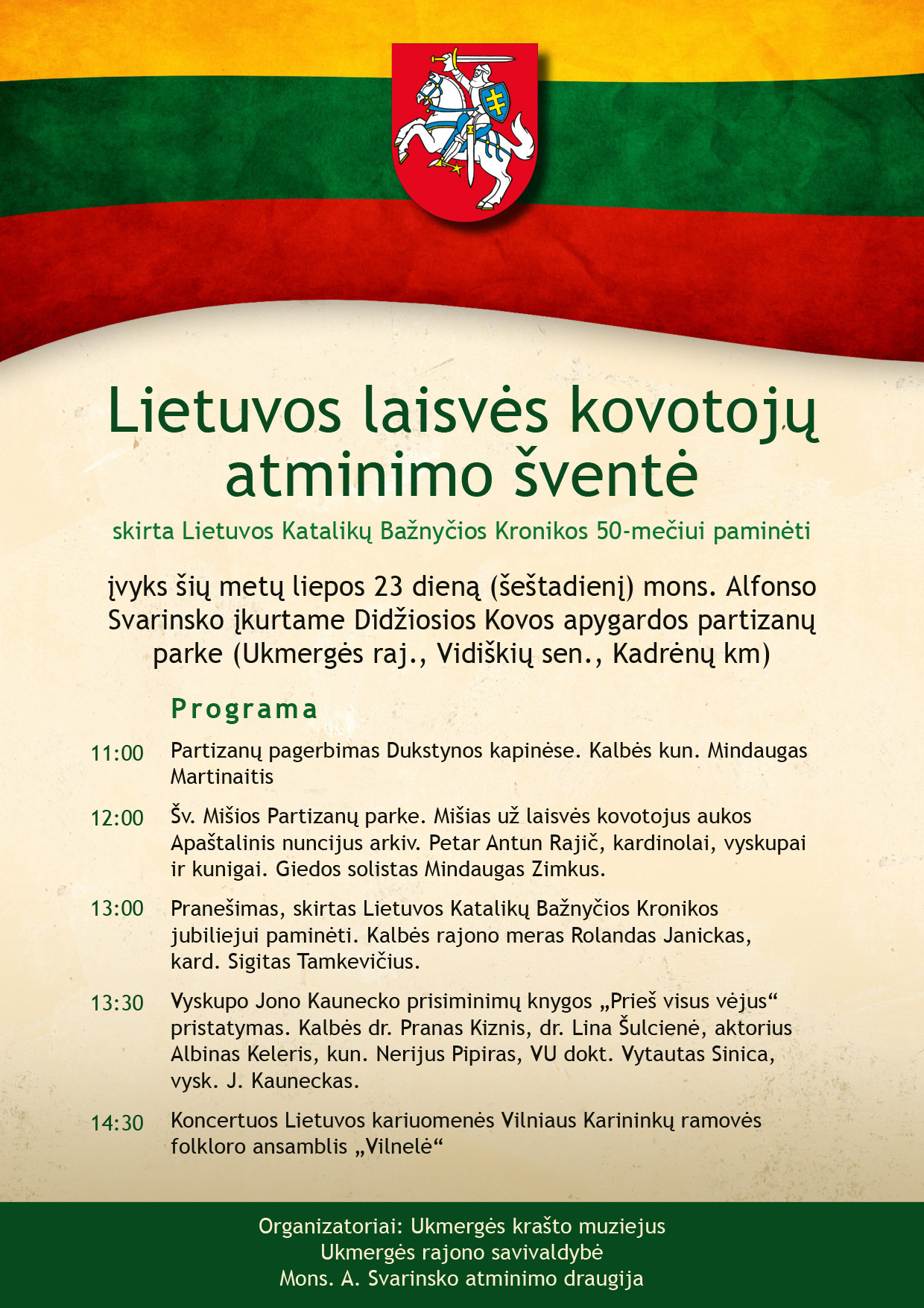 13:00 Pranešimas, skirtas Lietuvos Katalikų Bažnyčios Kronikos jubiliejui paminėti. Kalbės rajono meras Rolandas Janickas, kard. Sigitas Tamkevičius.