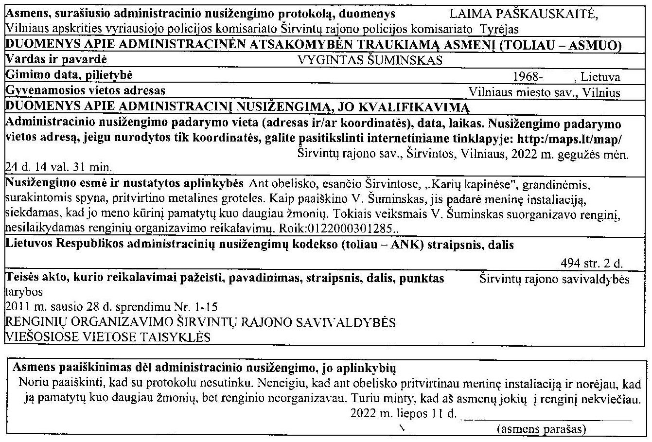 „Noriu paaiškinti, kad su protokolu nesutinku. Neneigiu, kas ant obelisko pritvirtinau meninę instaliaciją ir norėjau, kad ją pamatytų kuo daugiau žmonių, bet renginio neorganizavau. Turiu minty, kad aš asmenų jokių į renginį nekviečiau“