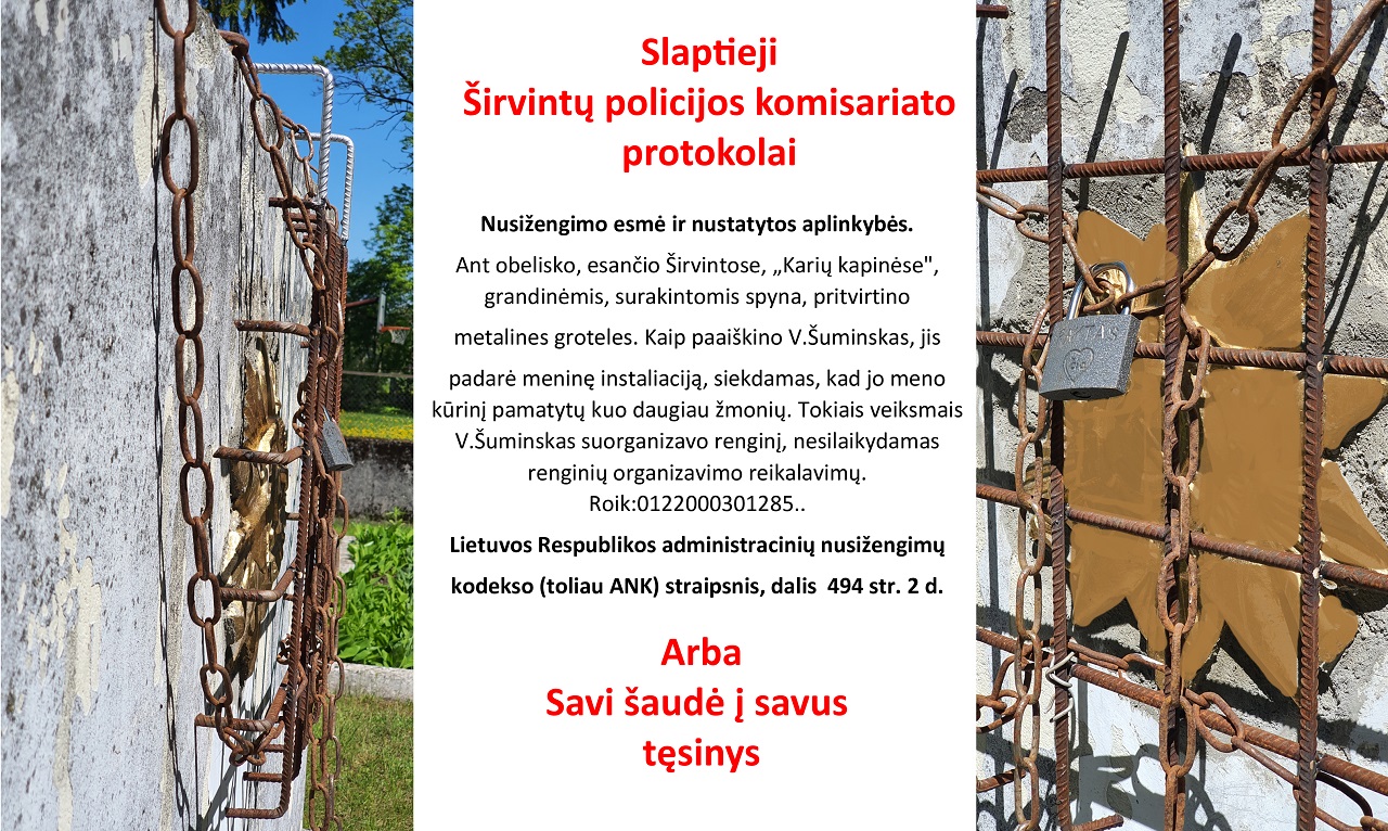 Bet vienas tvirtas, drąsus ir pilietiškas Širvintų menininkas neapsikentė. Ėjo gegužės 24 diena ir jo kantrybė ėjo į pabaigą. Gerai iš akies prisimatavęs, pagamino grotas. Atsivežė į kapines ir ant senų parūdijusių grandinių pakabino. Uždengė tą komunizmo simbolį, apsaugojo visuomenę nuo to tvaiko. Tokie ženklai, kartu su jų atnaujintojais turi būti atskirti nuo visuomenės.