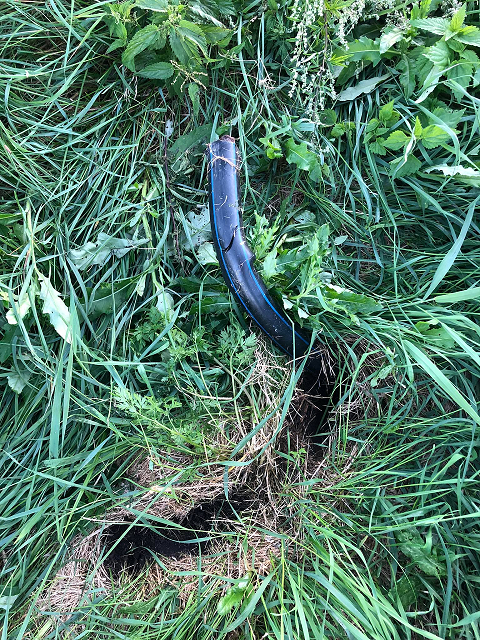 Juk riboženkliai stovi ten, kur pastatė geodezininkai ir jie tikrai ne taškelis žemėje, o metaliniai su ant jų užmautais daugiau kaip 150 cm aukščio raudonais ar raudonai purkštais vamzdžiais, todėl tikrai gerai matomi. Šienaujant tikrai yra galimybė juos apvažiuot, bet tie, kas šienauja – nesivargina, juk už riboženklius atsako pats žemės savininkas, o ne jie. Nors melioratorių pastatytus baltus kuoliukus apvažiuoja, tai kodėl negalima taip pasielgt ir su privačios žemės ribas žyminčiais kuoliukais. Nuotraukos padarytos prie šalia Vileikiškių einančio melioracijos griovio.