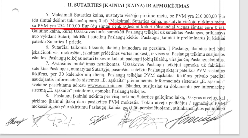 Numatyta sąlyga, kad paslaugos teikėjas neturi teisės reikalauti padengti jokių išlaidų, viršijančių paslaugų įkainius. Paslaugų teikimo terminas yra dvylika mėnesių. Tad vidutiniškai išeina, kad mėnesio paslaugų kaina yra apie 21 175 eurus.