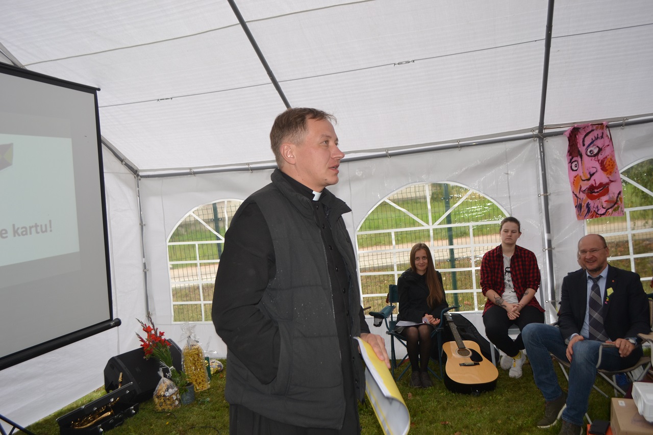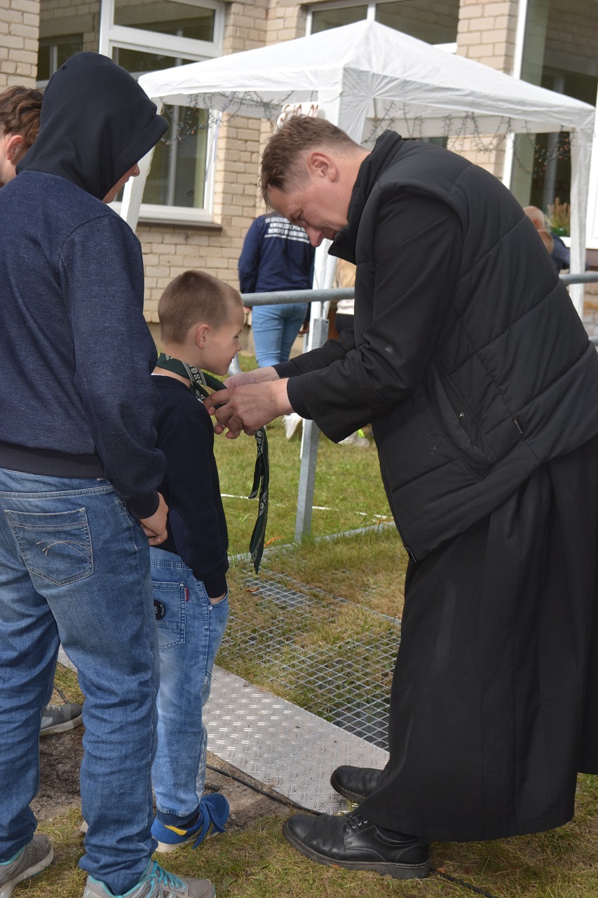Musninkų klebonas kunigas Marius Talutis sveikino visus su švente ir džiaugėsi, kiek gražių progų švęsti yra Musninkuose: bažnyčios jubiliejus, miestelio, vėliau bendruomenės namų atidarymas, dabar vaikų centro… Gyvenimas Musninkuose nuostabus. O šventindamas patalpas atsižvelgė į vaikų siūlymus, ką ir kodėl reikia šventinti (pavyzdžiui – laiptus, kad niekas lipdamas nenukristų…).