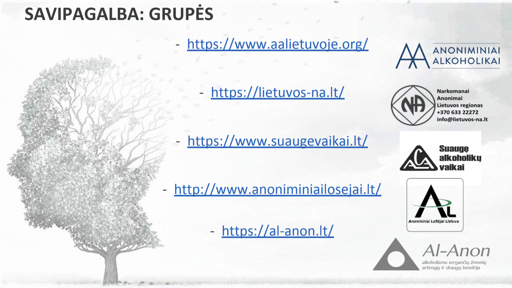 Viskas daroma, kad žmonės įveiktų žalingą vartojimą, priklausomybę neapribojant jų laisvės, neatribojant nuo šeimų, tačiau, jeigu nepavyksta įveikti vartojimo ar žmogus to nenori, imamasi veiksmų apsaugoti nuo vartojimo pasekmių likusius šeimos narius, ypač vaikus“, – pabrėžia seminarus socialiniams darbuotojams ir sveikatos priežiūros specialistams organizuojanti A. Kudzytė.