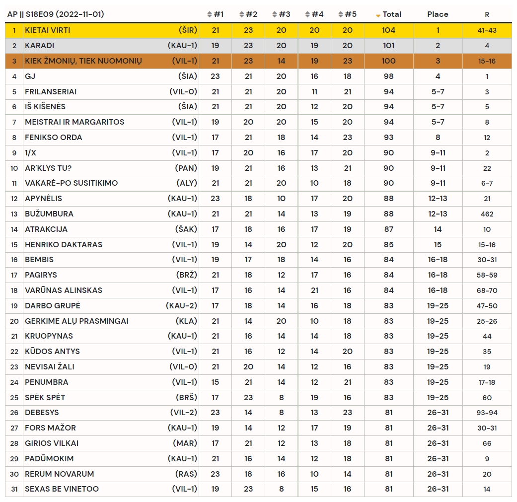 VI liko puikiai žaidimą užbaigęs BOKŠTAS, o nuo jų vos vienu taškeliu atsiliko 2 ir 3 turus gerai sužaidęs, helovyniška nuotaiką transliavęs RAUDNAS VERŠIS.