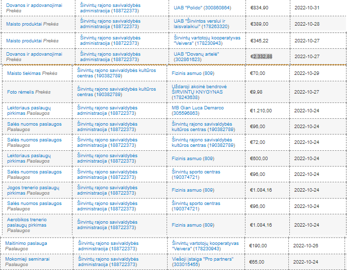 Tuo metu Širvintų rajono savivaldybės administracija perka pramogas, mokymus, seminarus. Tai randame Viešųjų pirkimų tarnybos puslapyje. Nuotraukoje po tekstu rasite keletą spalio mėnesio pirkimų.
