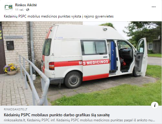 Štai Kėdainių leidinys „Rinkos aikštė“ skelbia, kad „PSPC mobilus medicinos punktas pagal iš anksto nustatytą grafiką vyksta į rajono gyvenvietes būtina medicinine įranga aprūpintu automobiliu. Į mobilų medicinos punktą atvykusiems pacientams matuojamas kraujospūdis, nustatomas gliukozės kiekis kraujyje bei kraujo įsotinimas deguonimi (saturacija), užrašoma elektrokardiograma.“ Toliau nurodomi kontaktai, kaip kiekvienas gali užsiregistruoti. Puiki paslauga, ypač kai žinai, koks sudėtingas susisiekimas su rajono centru.