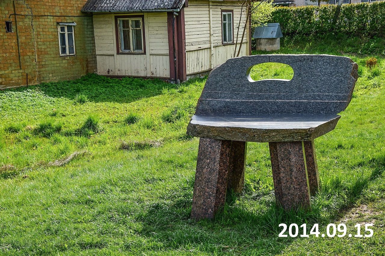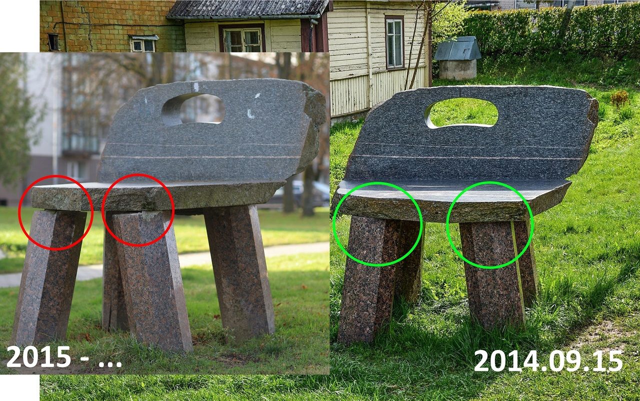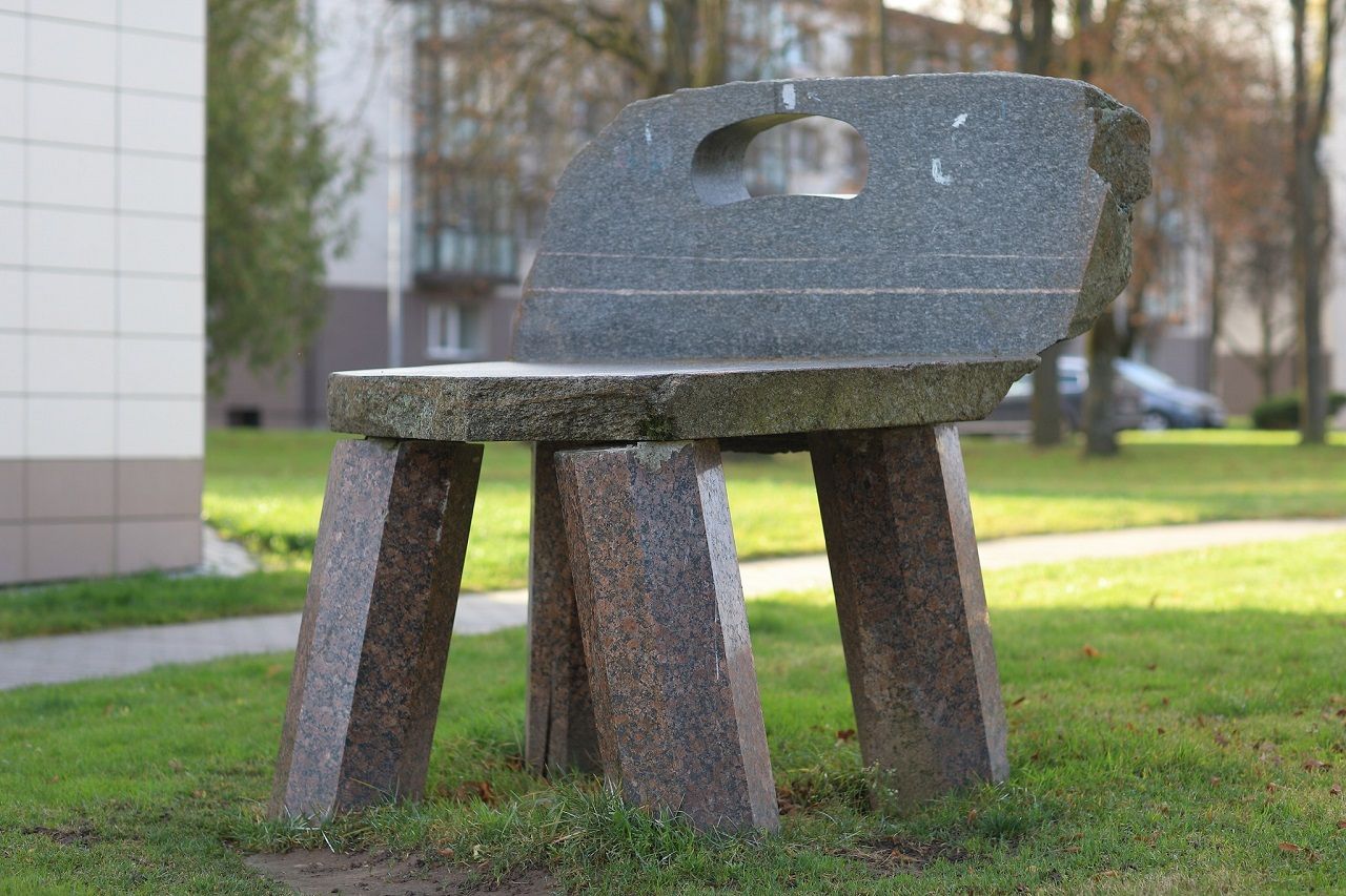 Taip ir stovi akmens skulptūra „Kėdė“ kitoje gatvės pusėje, šalia namo Vilniaus gt.45. esančioje pievelėje. Kojos lyg rachito išsukinėtos. Kėdės pagrindas pasviręs, lyg senas rąstinis namelis. Skiedinys iš sujungimo vietų baigia išbyrėti. Bet ji tebestovi dar vis…