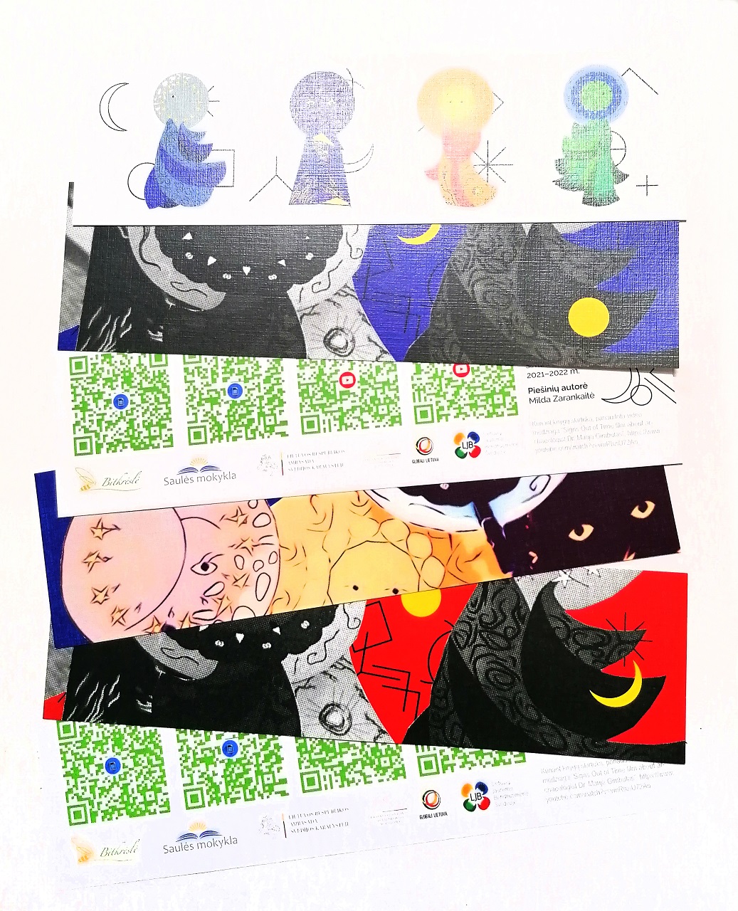 Geriausi mokinių darbai sugulė į virtualią parodą, kurią galima atrasti knygų skirtukuose. Dėl unikalios popieriaus lino raižinio spaudos faktūros skirtukai yra ne tik originalus, bet ir malonus liesti. Knygų skirtukus taip pat papuošė Mildos Zarankaitės skamių motyvais kurti piešiniai, baltų simboliai ir ornamentai, kurie senovėje reiškė informacijos perdavimą. Juose taip pat užkoduotas mokslininkės Marijos Gimbutienės indėlis į Europos kultūros ištakų tyrimus (švedų, anglų ir lietuvių kalbomis).