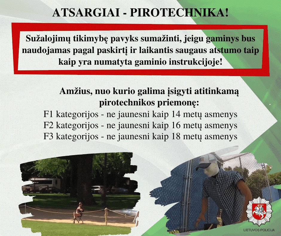 nesuveikusių pirotechnikos priemonių negalima uždegti pakartotinai, prie jų nereikėtų artintis dar kurį laiką;
