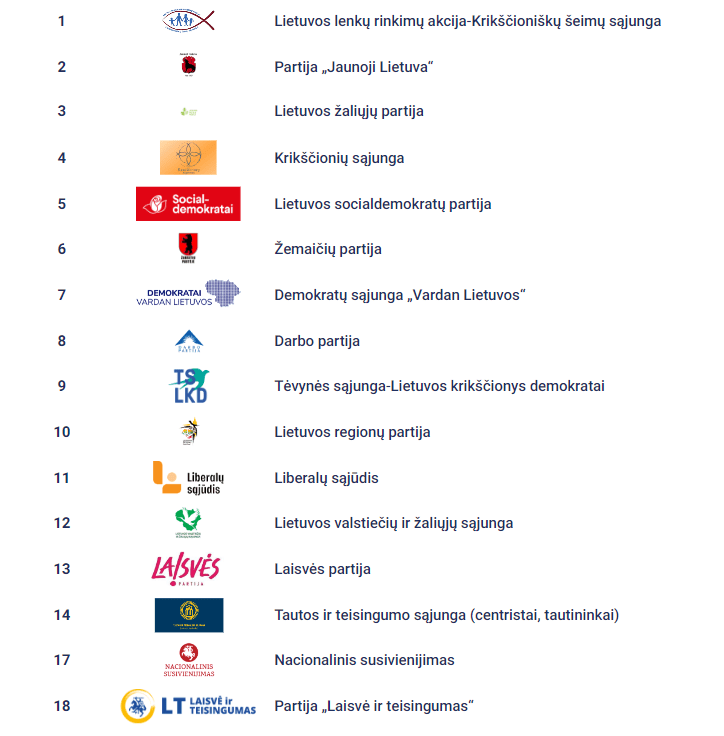 Politinių organizacijų eilė pagal jų ištrauktus numerius rinkimų biuleteniuose išsirikiuos taip: