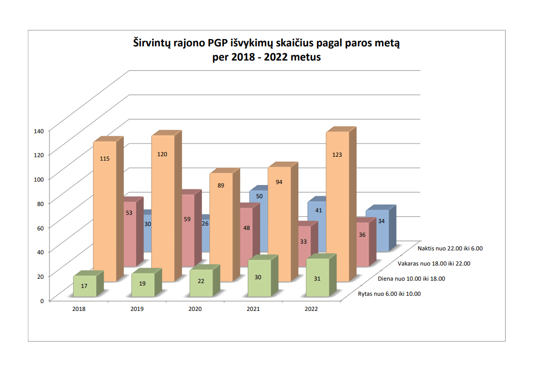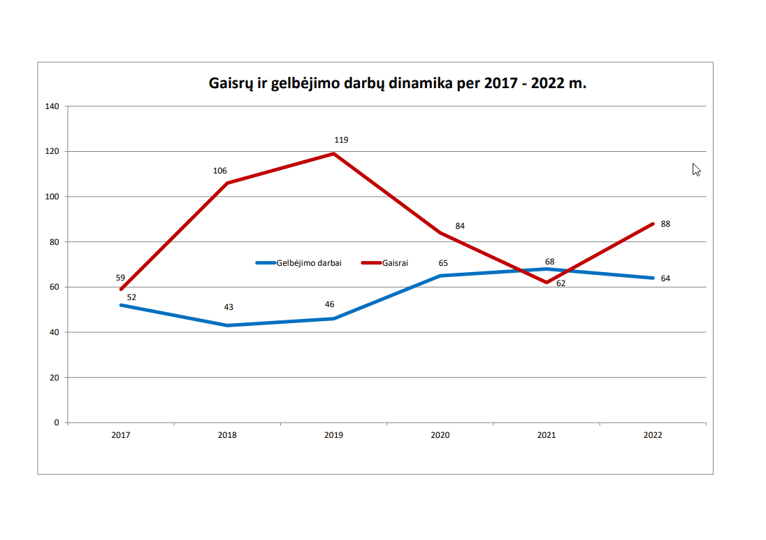 2022 metais ugniagesiai gelbėtojai daugiau gesino nei gelbėjo. 2022 metų pavasarį daugiausiai gaisrų kilo atviroje teritorijoje. Net 27 gaisrai kilo kovo mėnesį, kai birželio ir liepos mėnesiais kilo vos po 2 gaisrus. Gaisringiausi mėnesiai buvo – kovas, balandis ir rugpjūtis.