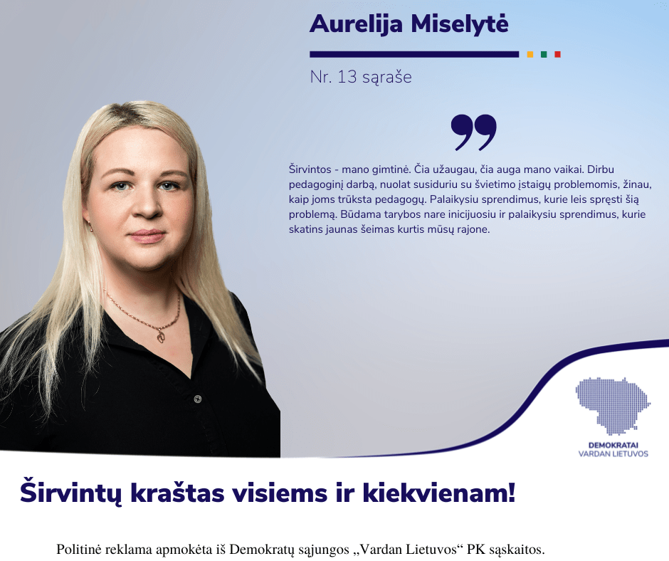 Širvintos – mano gimtinė. Čia užaugau, čia auga mano vaikai. Dirbu pedagoginį darbą, nuolat susiduriu su švietimo įstaigų problemomis, žinau, kaip joms trūksta pedagogų. Palaikysiu sprendimus, kurie leis spręsti šią problemą. Būdama tarybos nare inicijuosiu ir palaikysiu sprendimus, kurie skatins jaunas šeimas kurtis mūsų rajone.