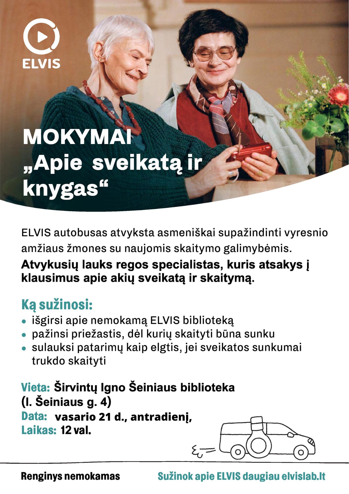 Vasario 21 d. 12 val. Lietuvos aklųjų bibliotekos komanda atvažiuos į Širvintų Igno Šeiniaus viešąją biblioteką ir skaitykloje surengs susitikimą, kurio metu pristatys ELVIS biblioteką, parodys, kaip užsiregistruoti. Kartu atvyks ir optometrininkas, kuris atsakys į senjorų klausimus apie regą ir skaitymo sunkumus.