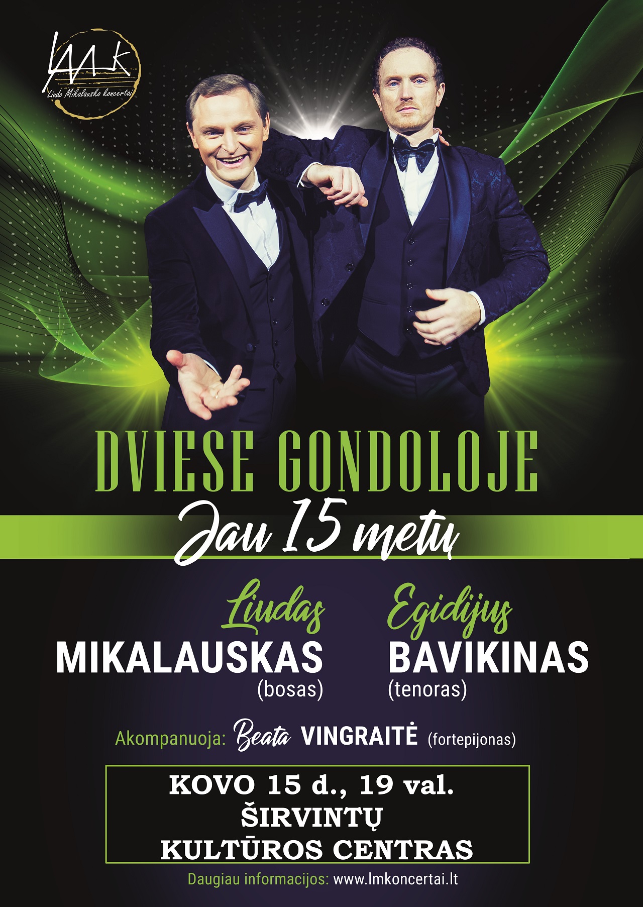 Kur tik jie nuvyksta, ten iš karto gimsta šventė! Jų nepaprastas gebėjimas bendrauti su publika, subtilus humoro jausmas sukuria betarpišką atmosferą, kuri kiekvienam žiūrovui leidžia pasijusti koncerto dalimi – ploti, dainuoti, šokti ir nubraukti juoko ašarą kartu su mylimais dainininkais. Neseniai uždainavus Venecijoje garsiąją „O sole mio“ ir pamačius, kaip publika yra pasiilgusi jų atliekamų dainų, atlikėjai nusprendė ryžtis ir 15 metų bendro dainavimo proga pakeliauti po Lietuvą. Nepraleiskite progos apsilankyti neužmirštamame vakare, kartu su šmaikščiųjų scenos bičiulių dainomis bent mintimis paplaukioti Venecijos kanalais, grožėtis lietuviškomis dainomis, įspūdingiausiais operetės duetais.