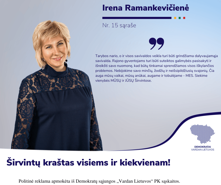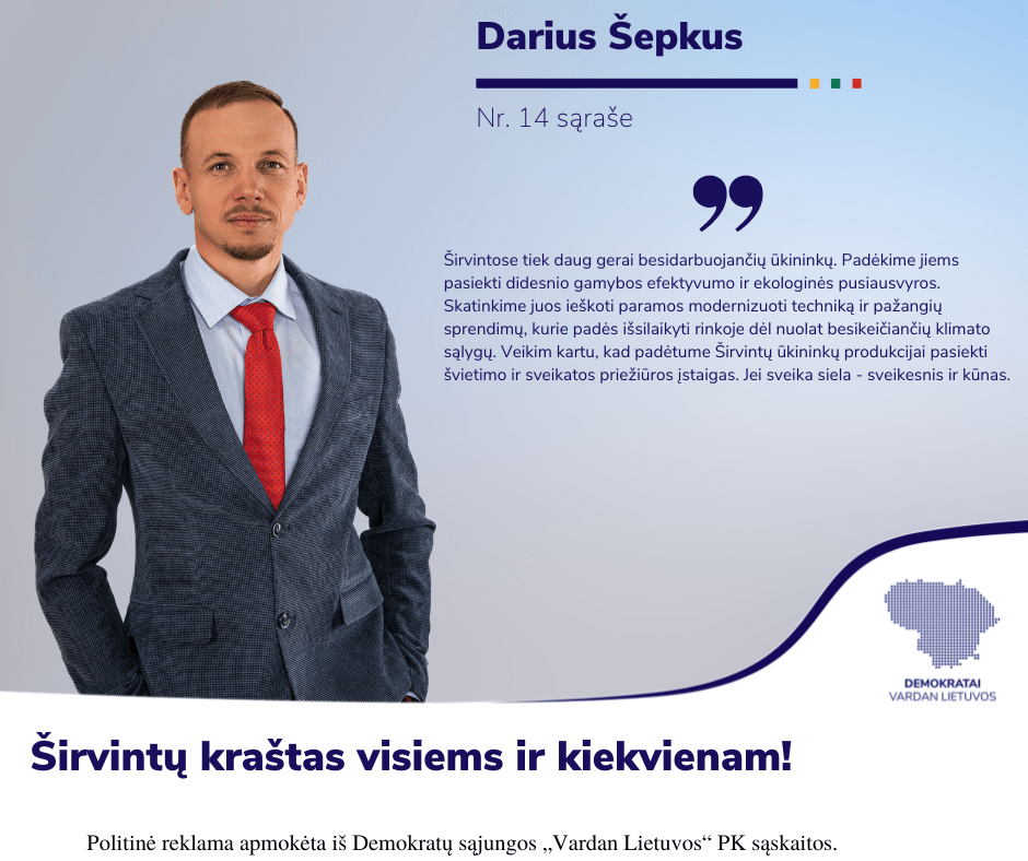 Politinė reklama bus apmokėta iš “Demokratų sąjungos “Vardan Lietuvos” rinkiminės kampanijos sąskaitos pagal sutartį ŠS 22-04. Užsakymas ŠS 23-07-66