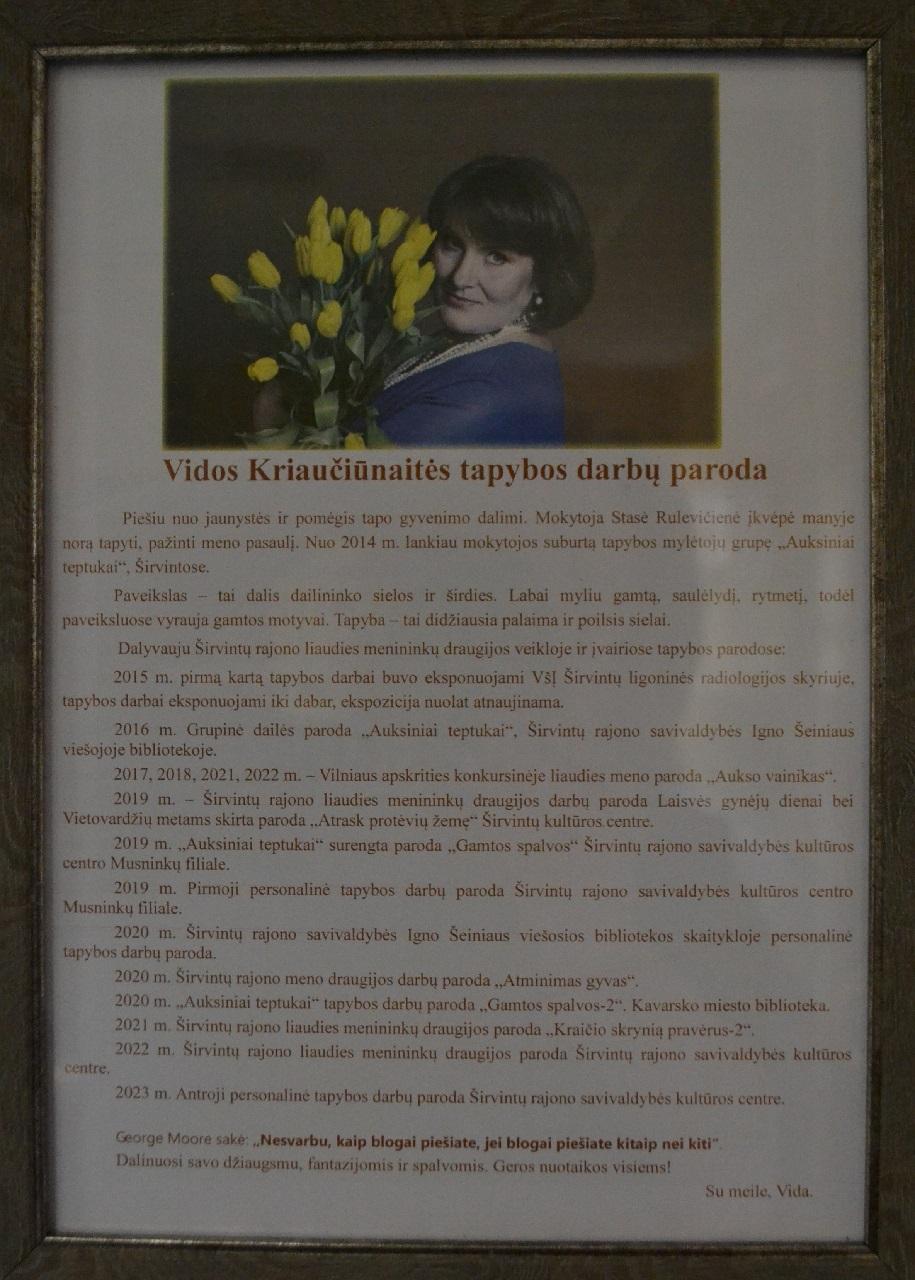 Žvarbaus ketvirtadienio vakarą Musninkų filiale rinkosi meno mylėtojai ir Vidos draugai. Čia atidaryta antroji personalinė Vidos Kriaučiūnaitės tapybos darbų paroda Musninkuose. Musninkuose tai antroji paroda, tačiau rajone Vidos darbai eksponuoti jau ne vieną kartą ir jau spėjo susirinkti savo gerbėjų ratą. O pati pirmoji, tiesa neoficiali, paroda daugumai širvintiškių ir rajono gyventojų nuolat matoma Širvintų poliklinikos foje prie rentgeno kabineto. Kurią Vida nuolat atnaujina naujausiais savo darbais.