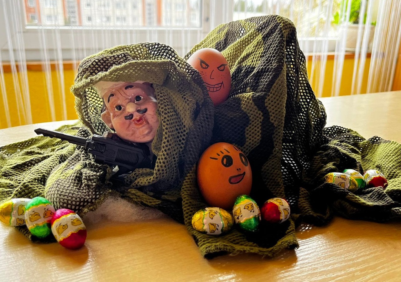 Ir Sienos kontrolės skyriaus vyresniosios specialistės Dženetos Ramanauskienės Velykos: ,,Ei ,zuiki, juk mes lapkričio 4 buvom abu Pavoverėje, lipk iš tos eglės, vėl varom ten,- daužysim kiaušinius!